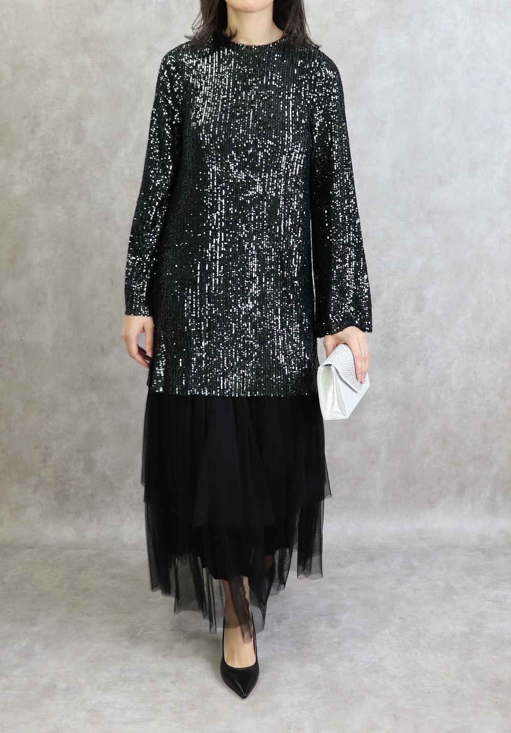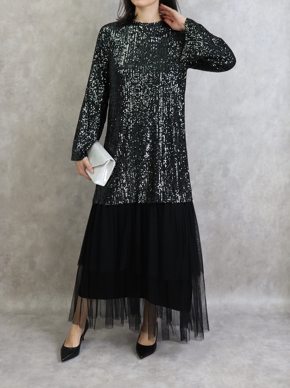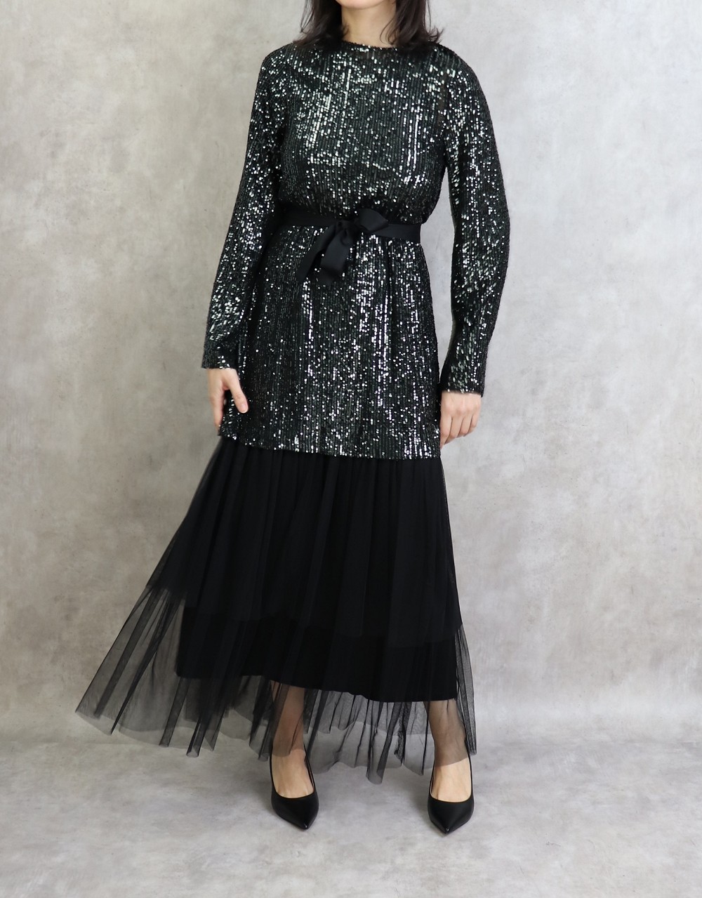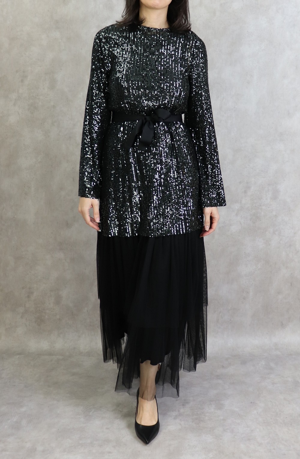 Tenue de soirée 2 pièces: Robe : longue, à bretelle, moitié du bas en tulle. Haut : mi long,col rond, coupe droite tout en strass. Fournit avec une ceinture noire pour dessiner la taille.