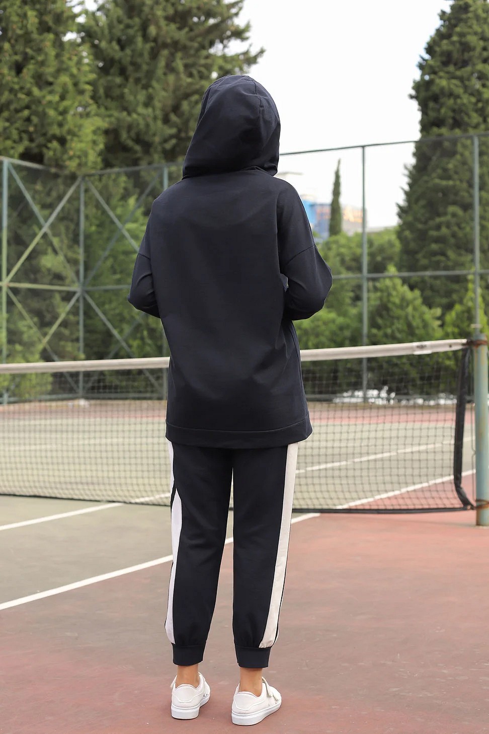 Survêtement femme deux pièces bicolore à capuche (Ensemble sport hijab pas cher) - Couleur noir avec bandes blanches - REF. 35199 (19.90 €)