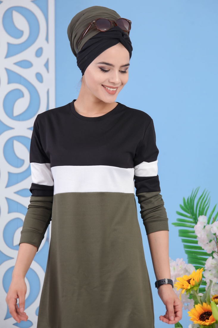 Robe moderne décontractée à capuche pour femme (Modest Fashion) - Couleur noir blanc et kaki - REF. 32965 (24.90 €) - En Promotion à 17.90 €
