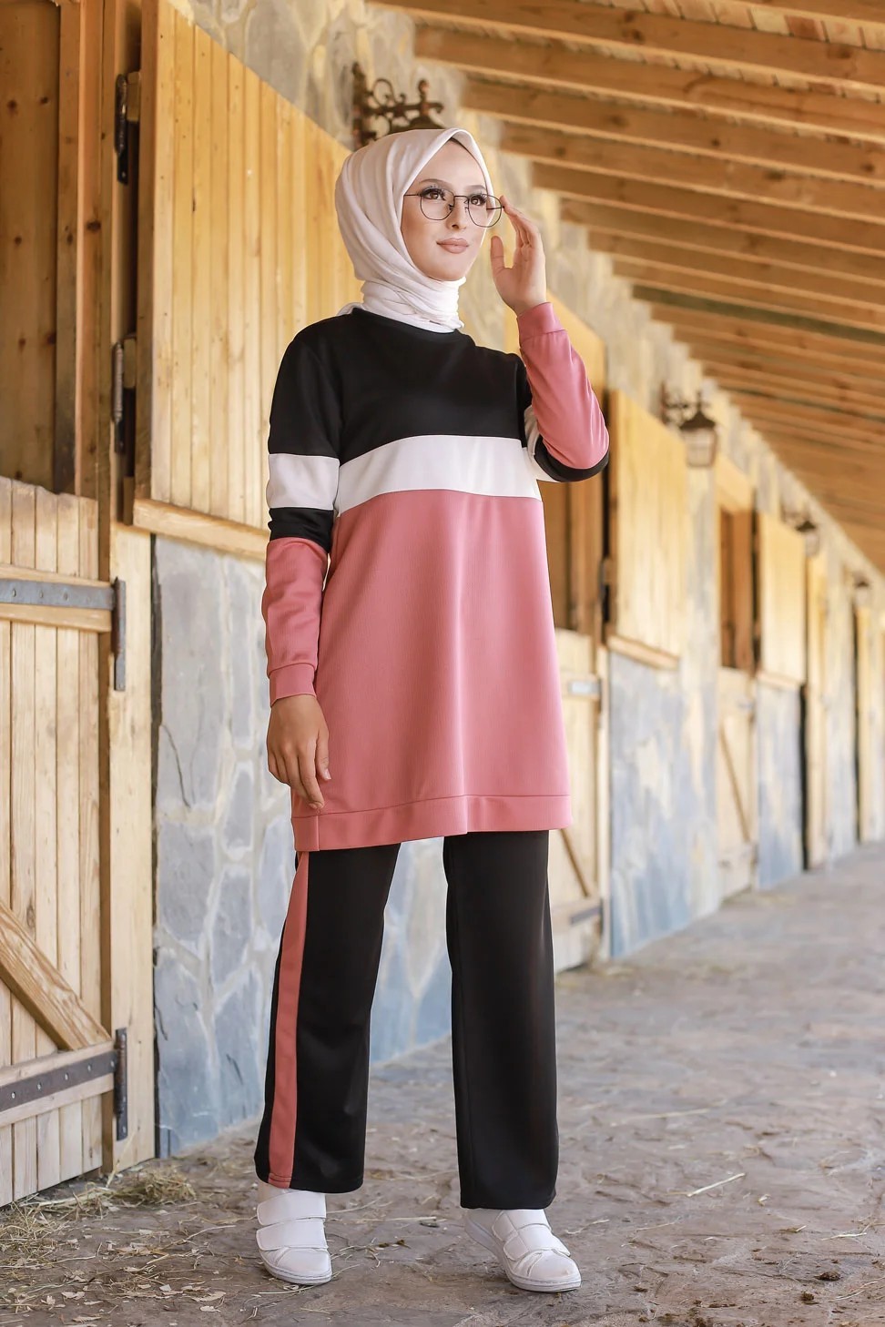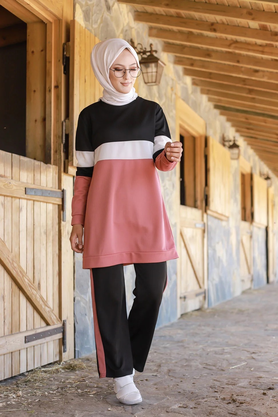 Ensemble survêtement 2 pièces de couleur noir et rose pâle (Vêtement sport et hijab pour femme) Vetement & Accessoire