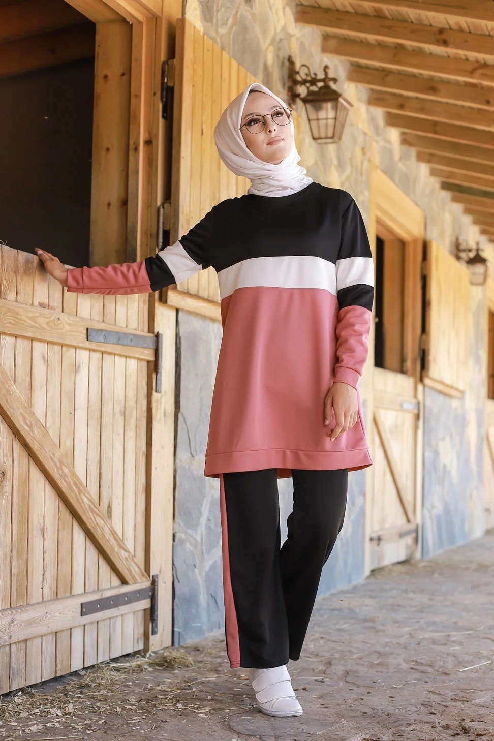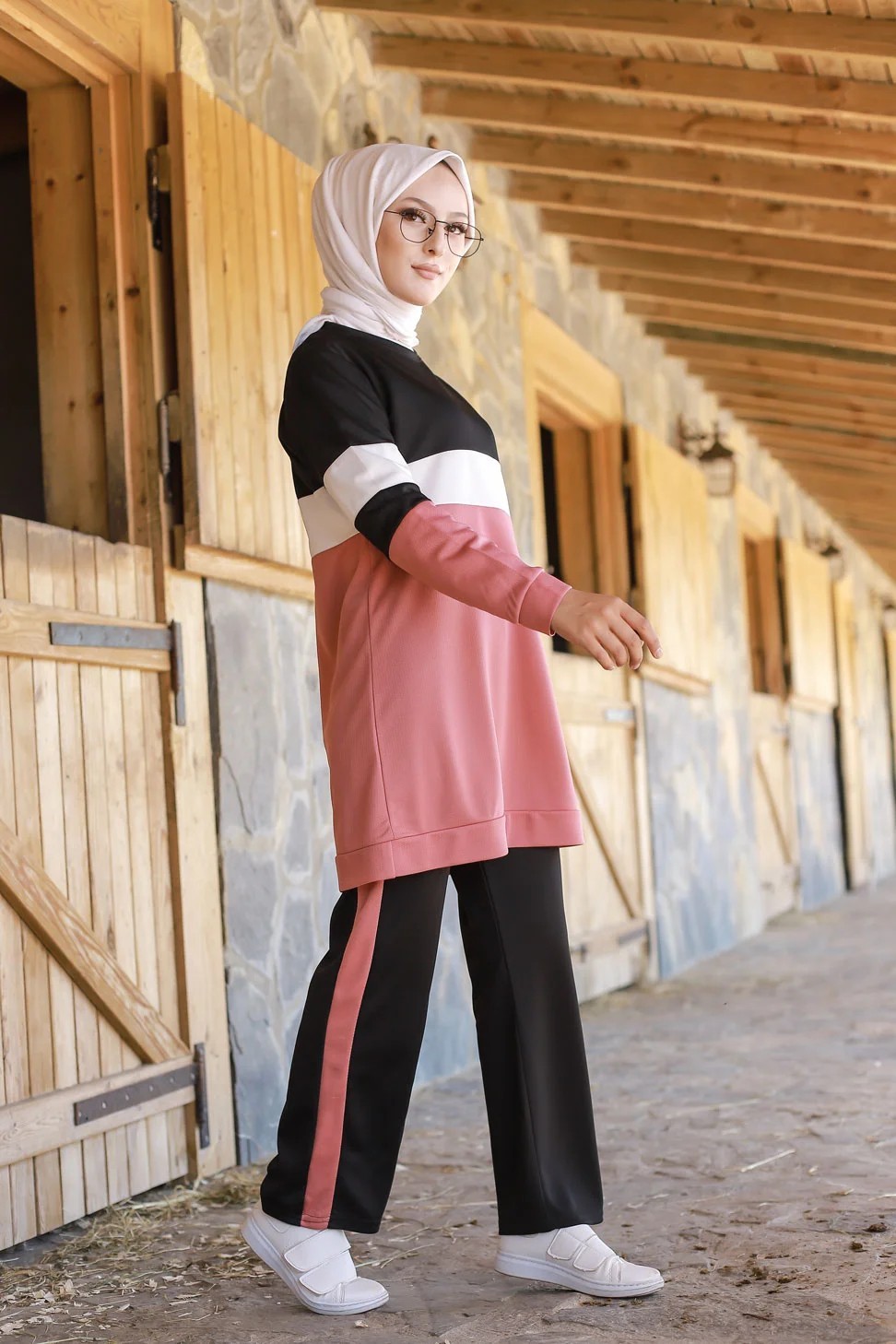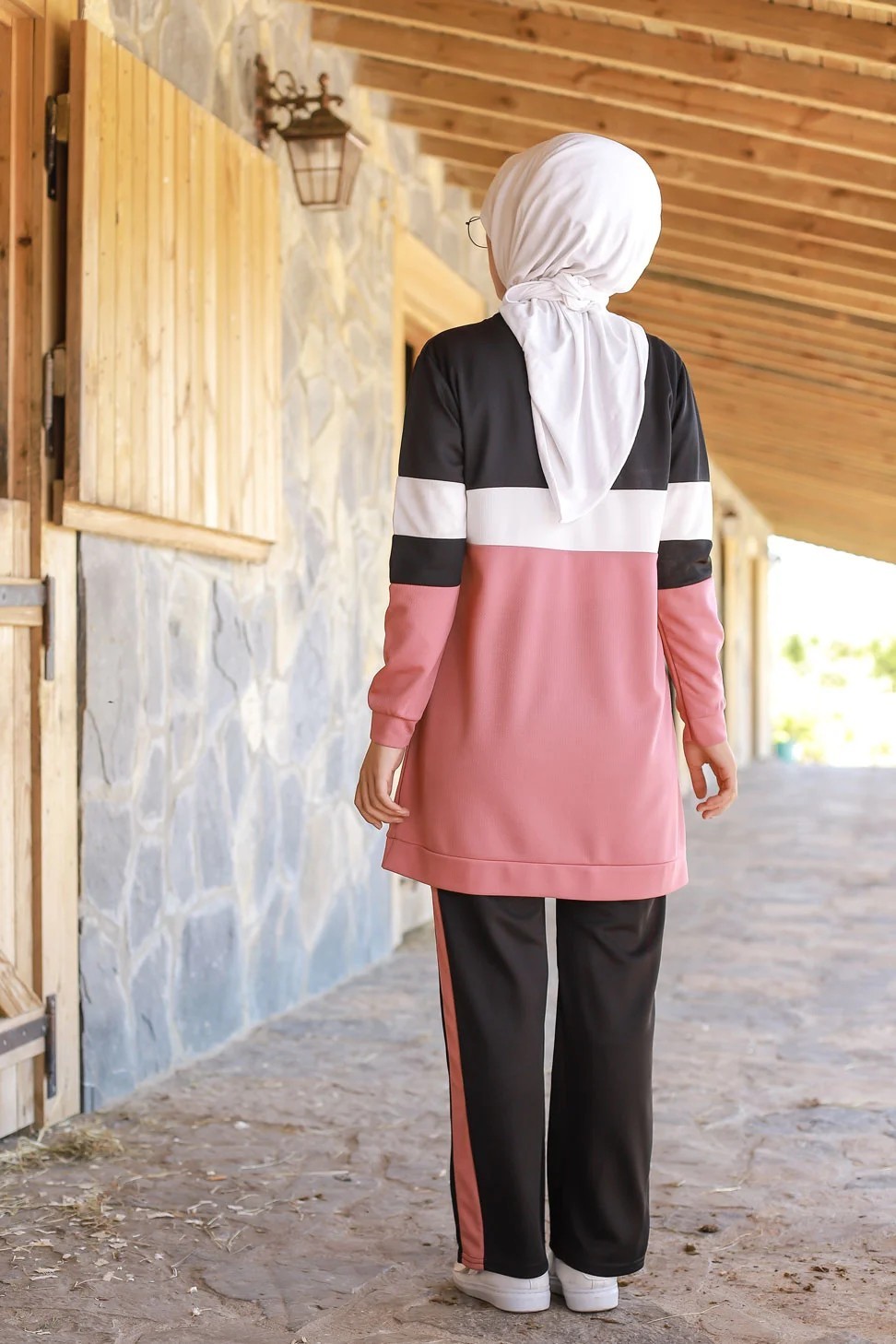 Ensemble décontracté et tenue de sport 2 pièces pour femme (Mode musulmane) - Couleur rose et blanc