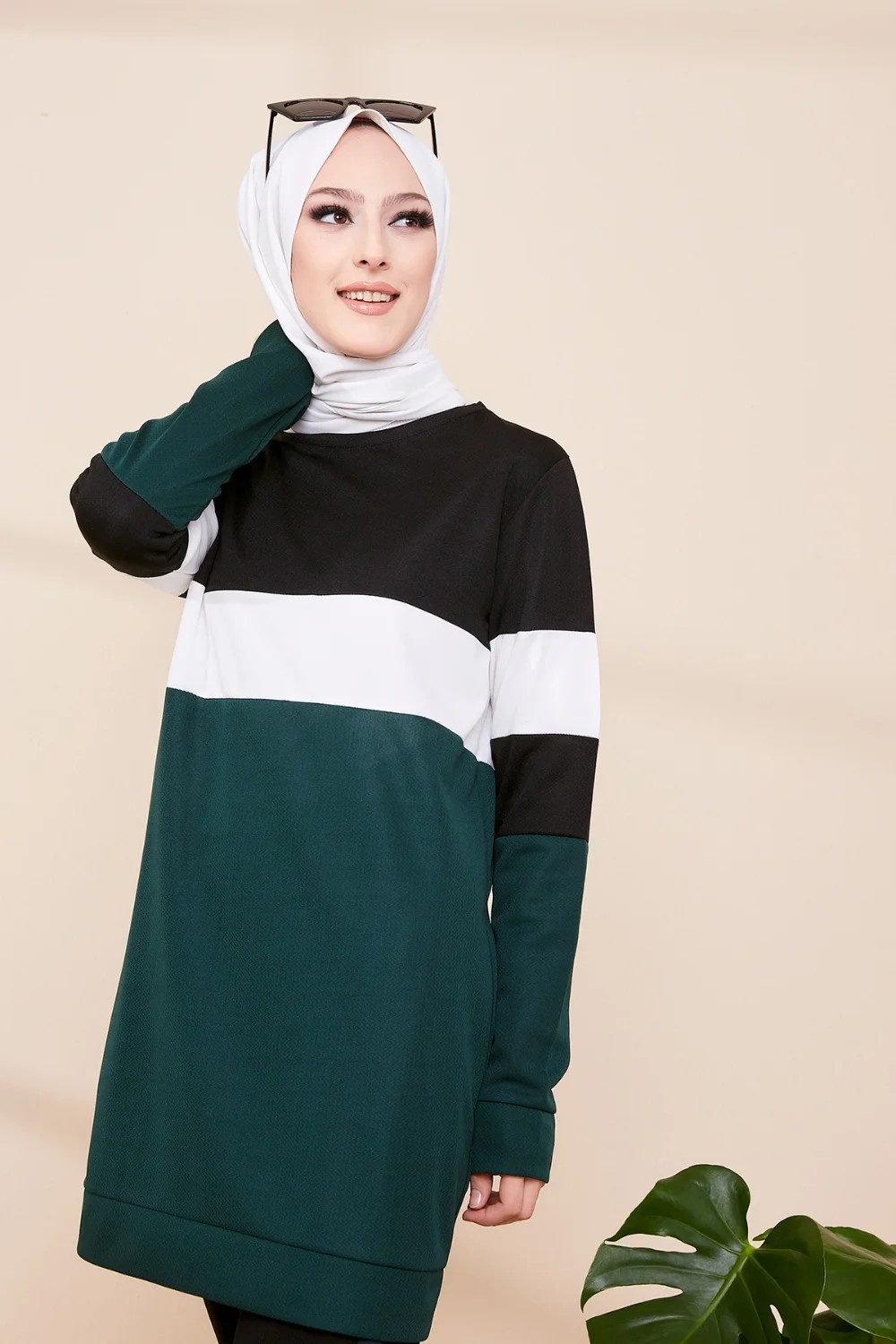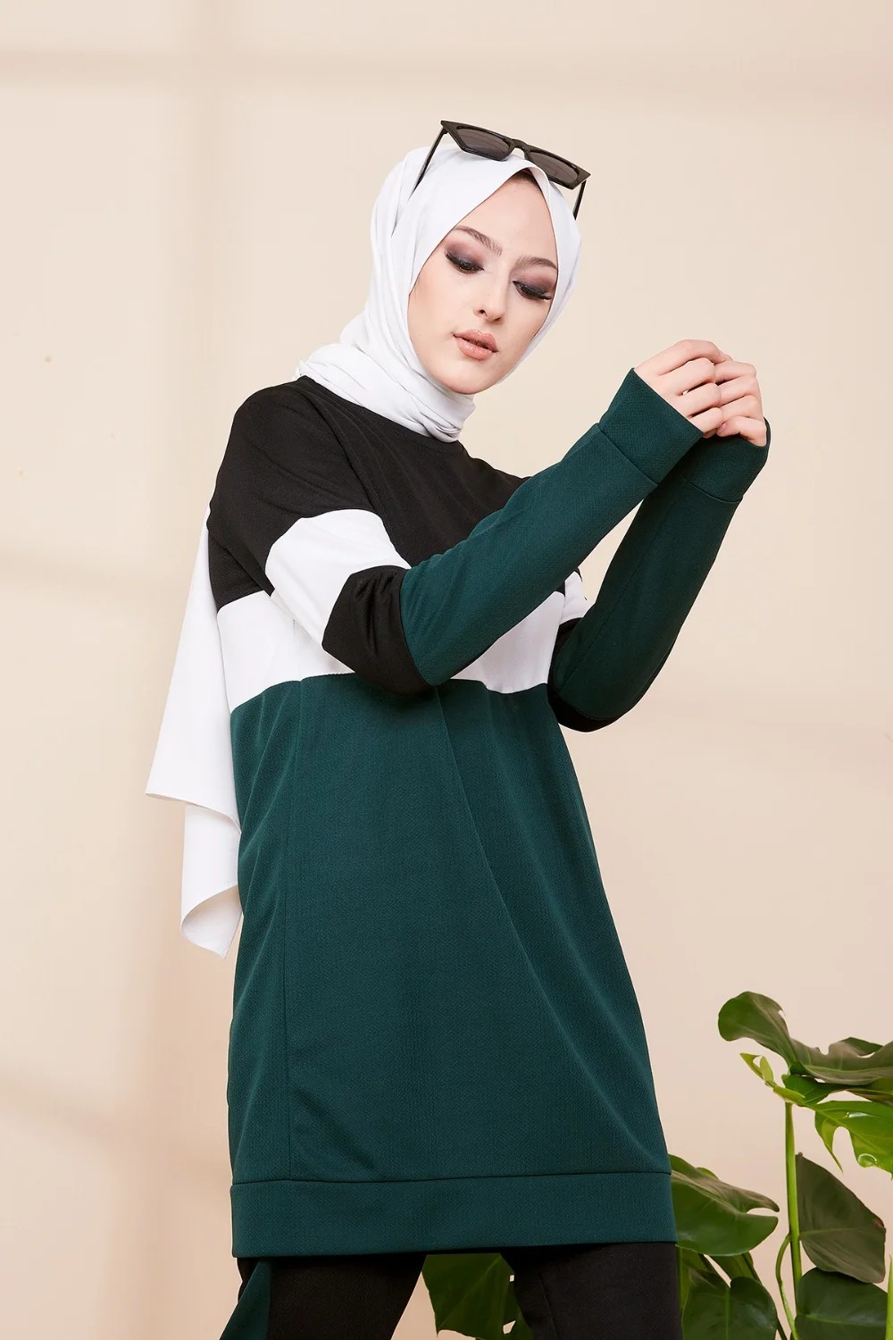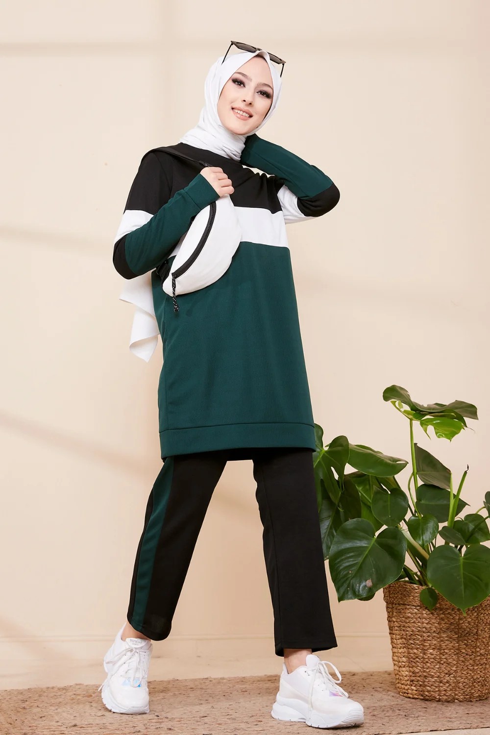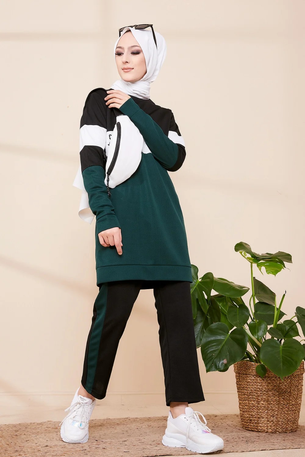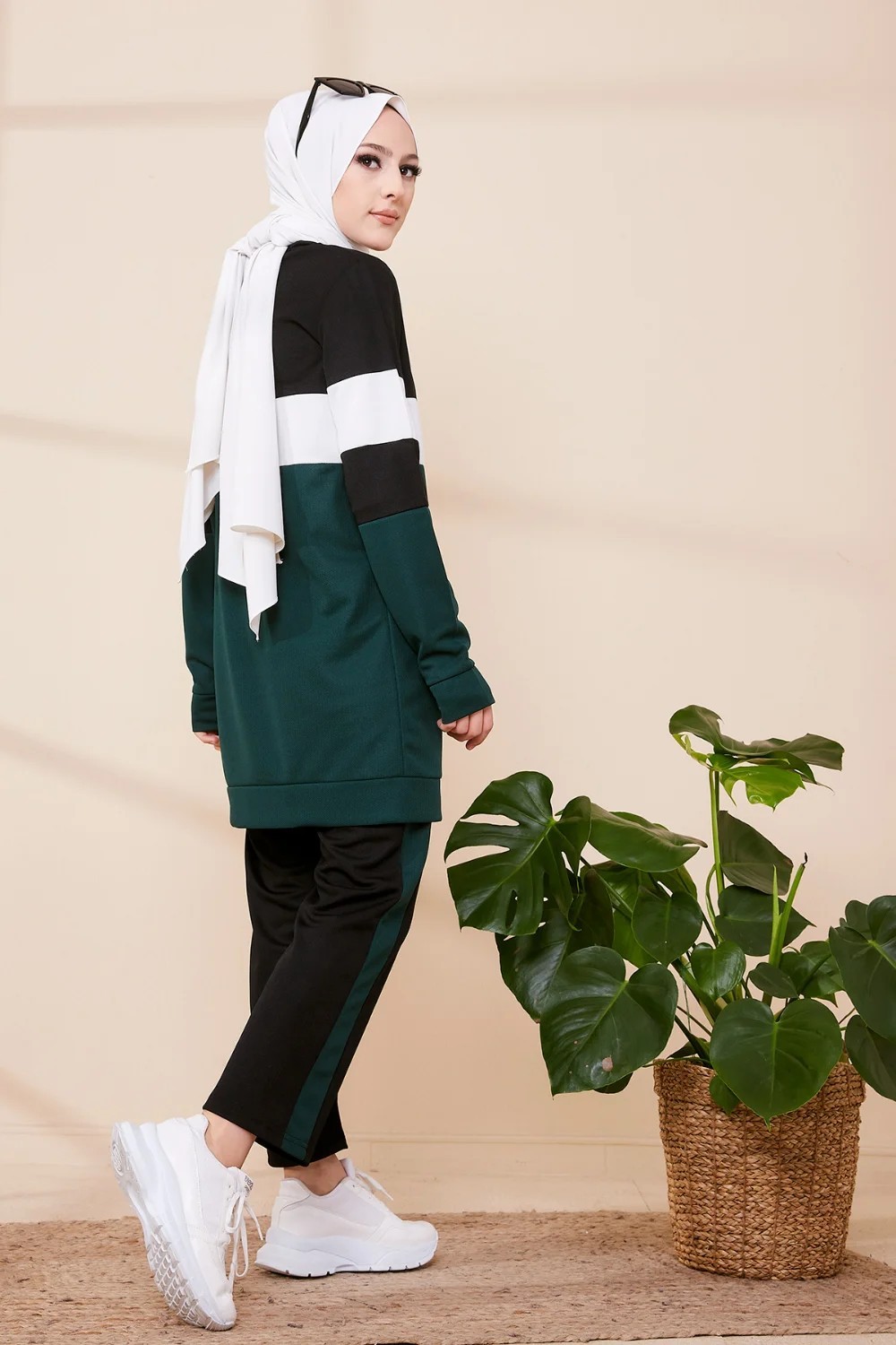 Ensemble survetement decontracte 2 pieces de couleur noir et vert emeraude pour femme (Vetement de sport pour Hijab)