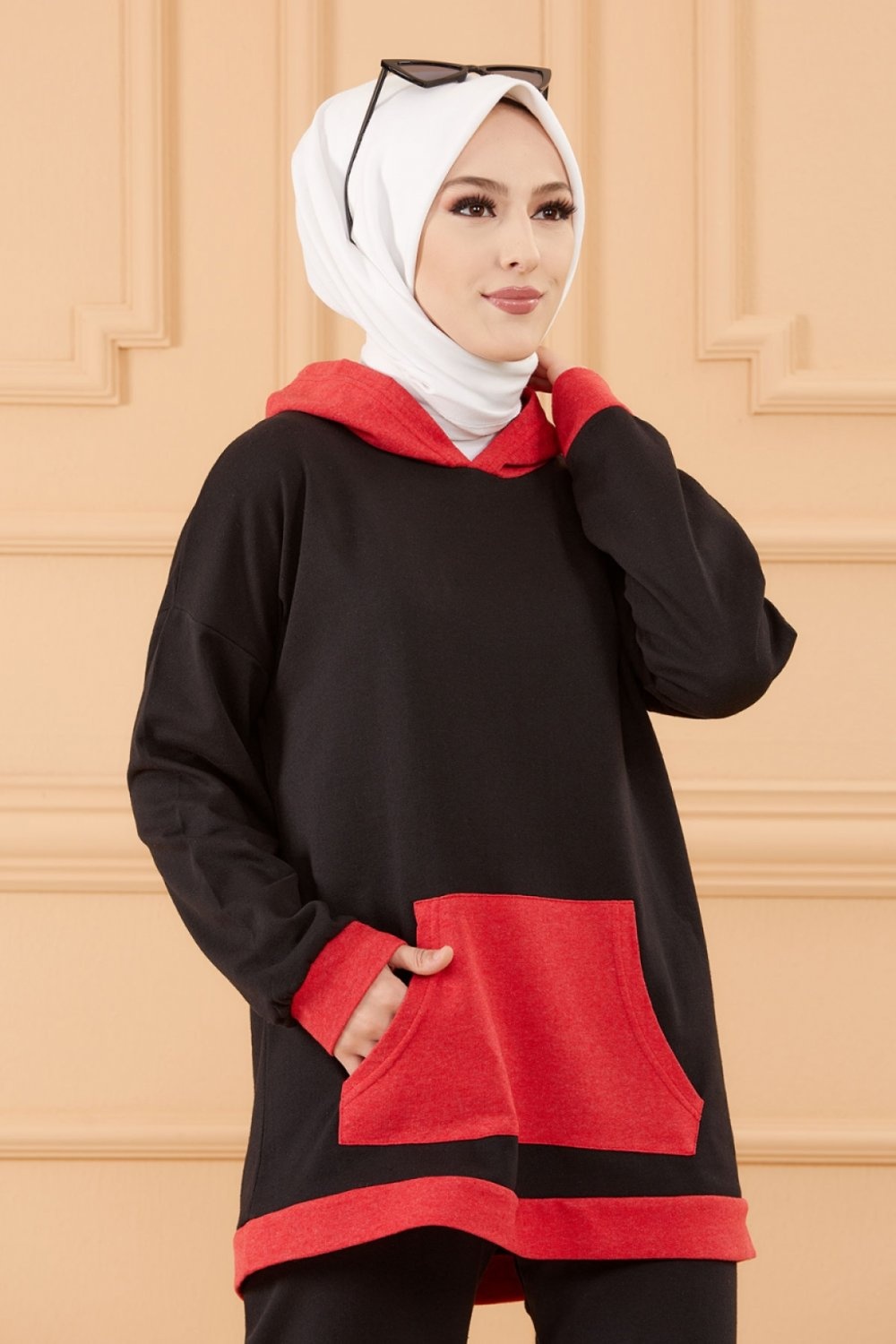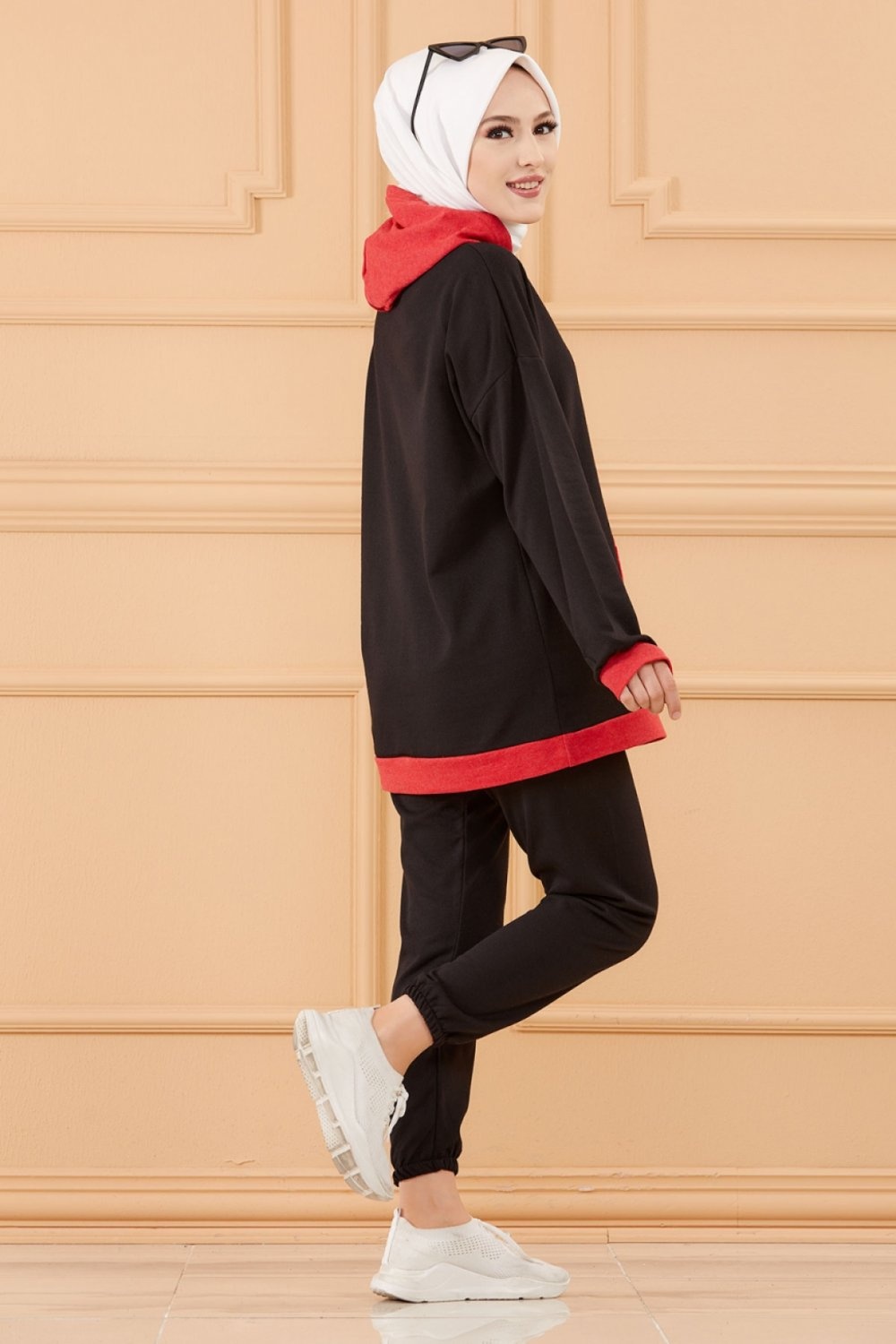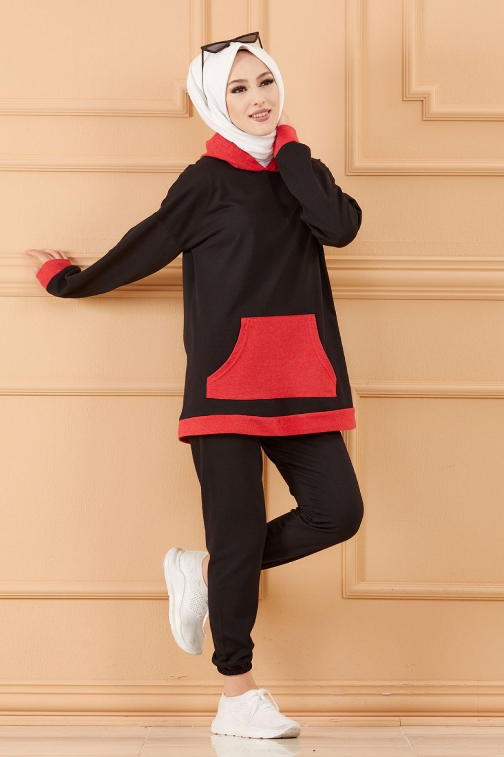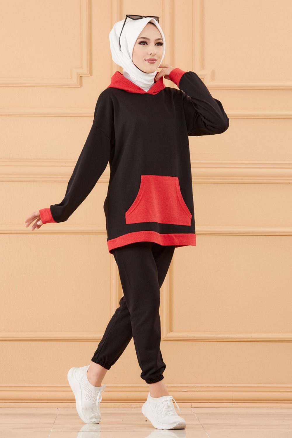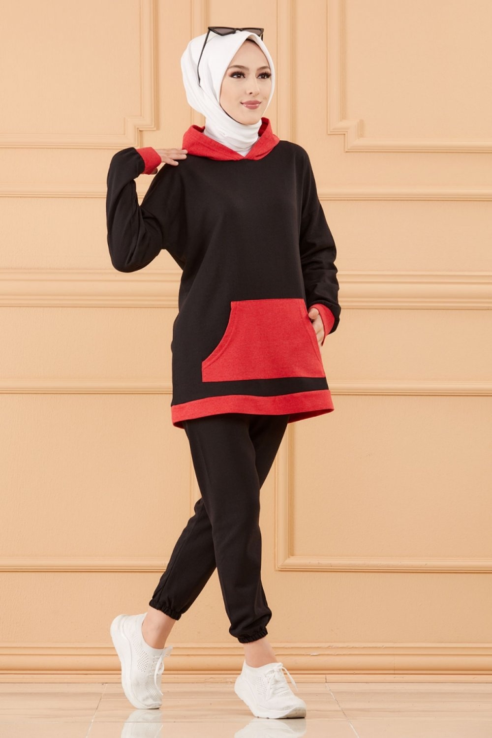 Ensemble survêtement décontracté (Vêtement de sport pour femme voilée) - Tunique couleur noir et pantalon rouge Vetement & Accessoire