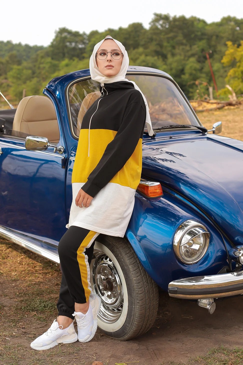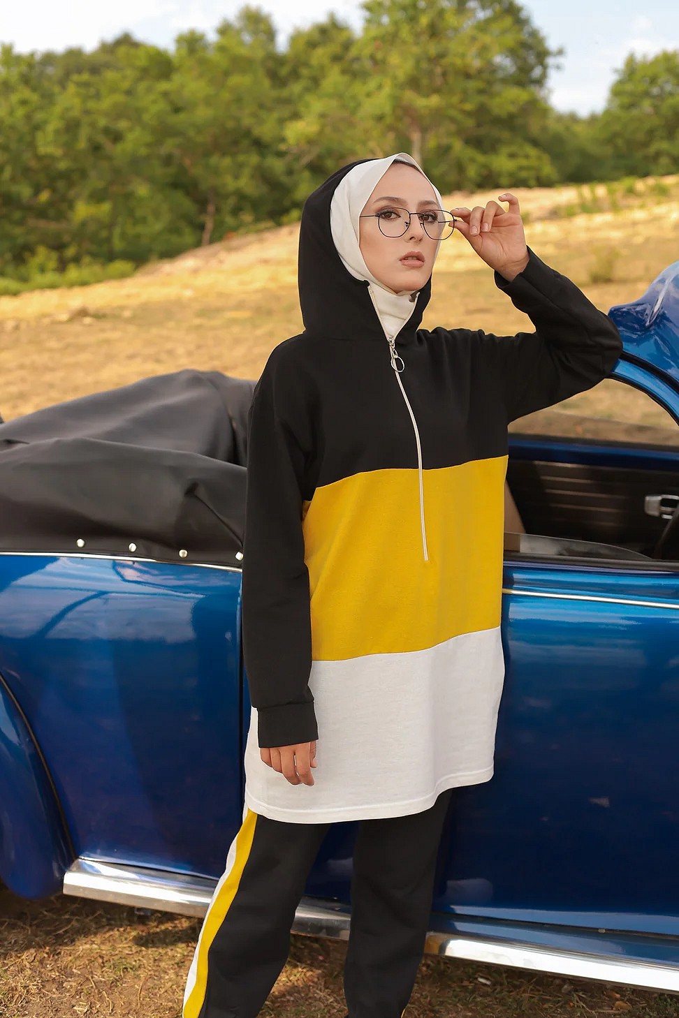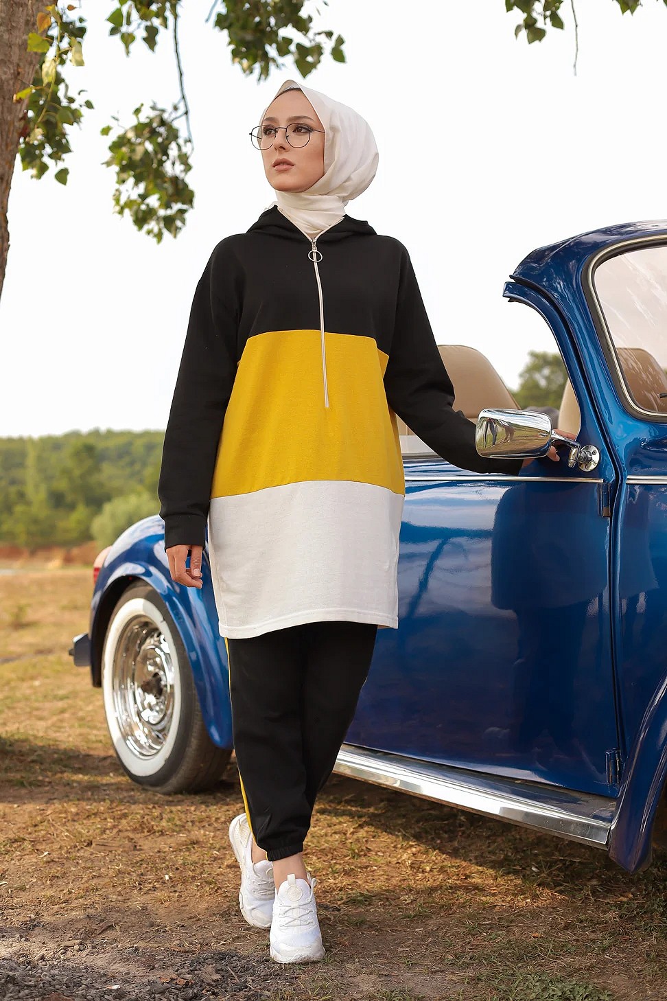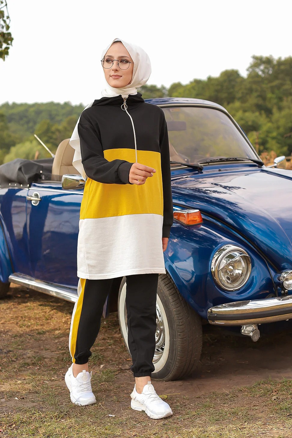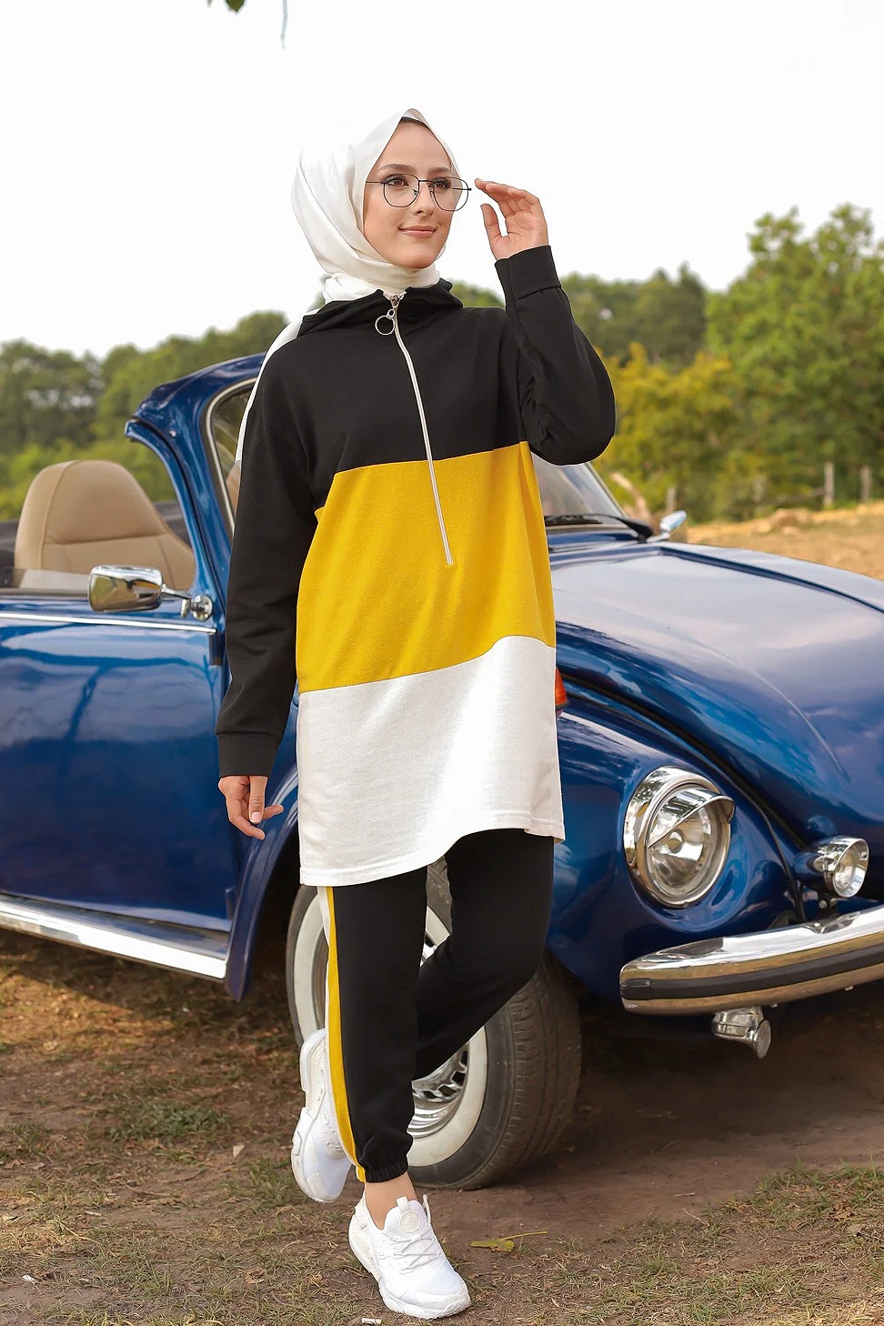 Ensemble survetement tricolore pour femme : tunique zippee a capuche et pantalon (Vetement islam) - Couleur noir blanc et Jaune