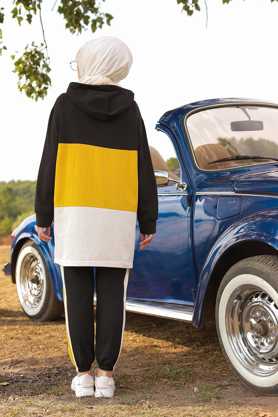 Ensemble survêtement tricolore pour femme : tunique zippée à capuche et pantalon (Vetement islam) - Couleur noir blanc et Jaune Vetement & Accessoire