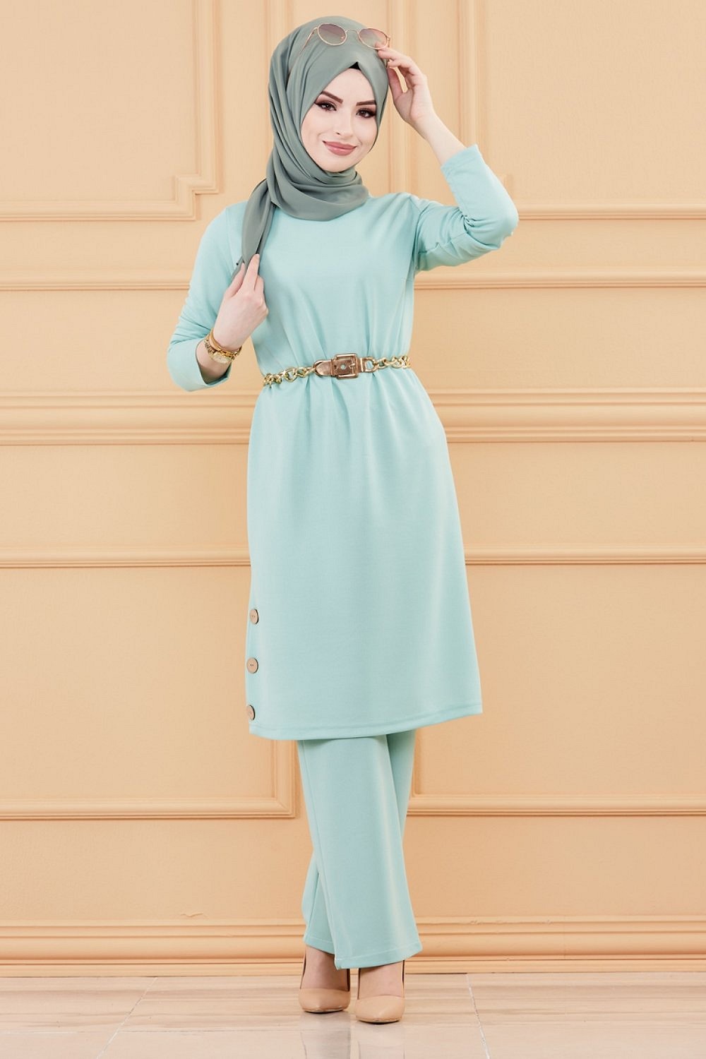 Ensemble tunique perlée et pantalon pour femme (Tenue Hijab Modest Fashion) - Couleur menthe - REF. 36532 (39.90 €)
