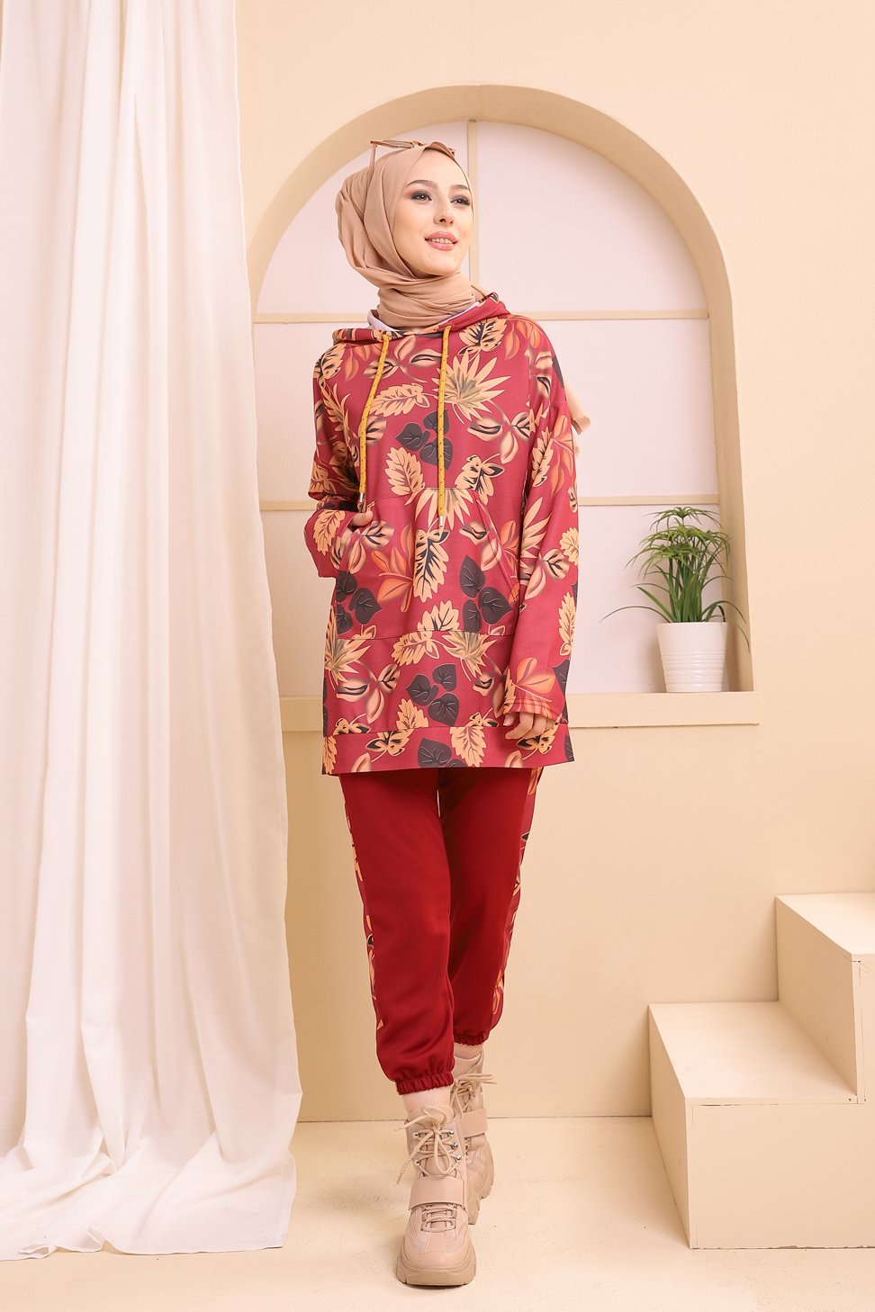 Ensemble survêtement tricolore pour femme : tunique zippée à capuche et pantalon (Vetement Hijab 2021) - Couleur noir blanc et bordeaux - REF. 33241 (29.90 €)