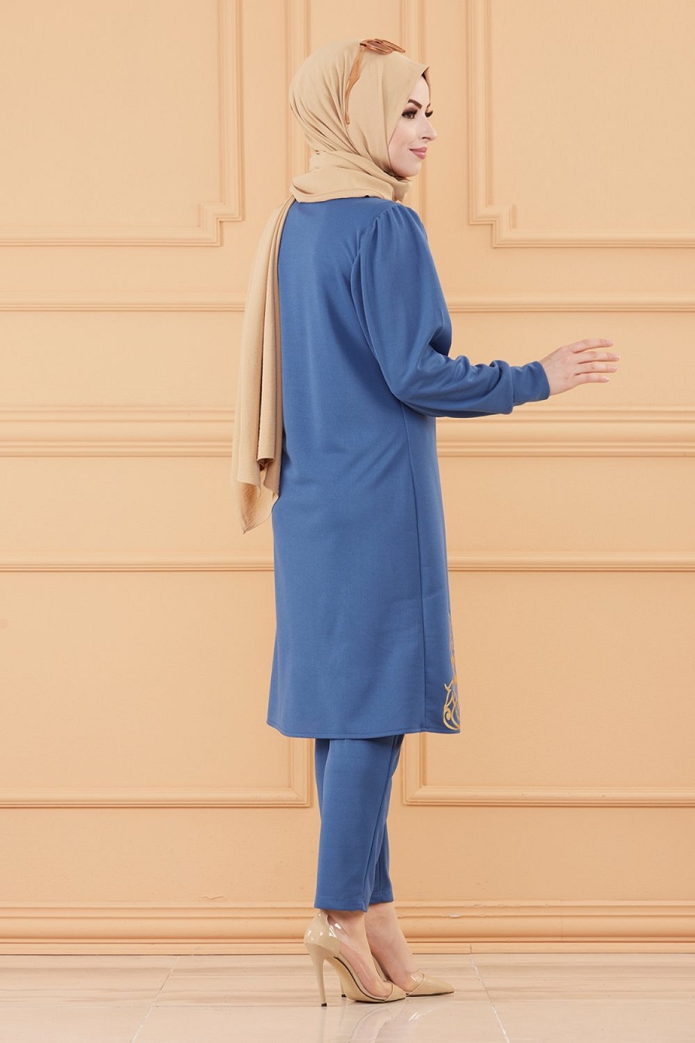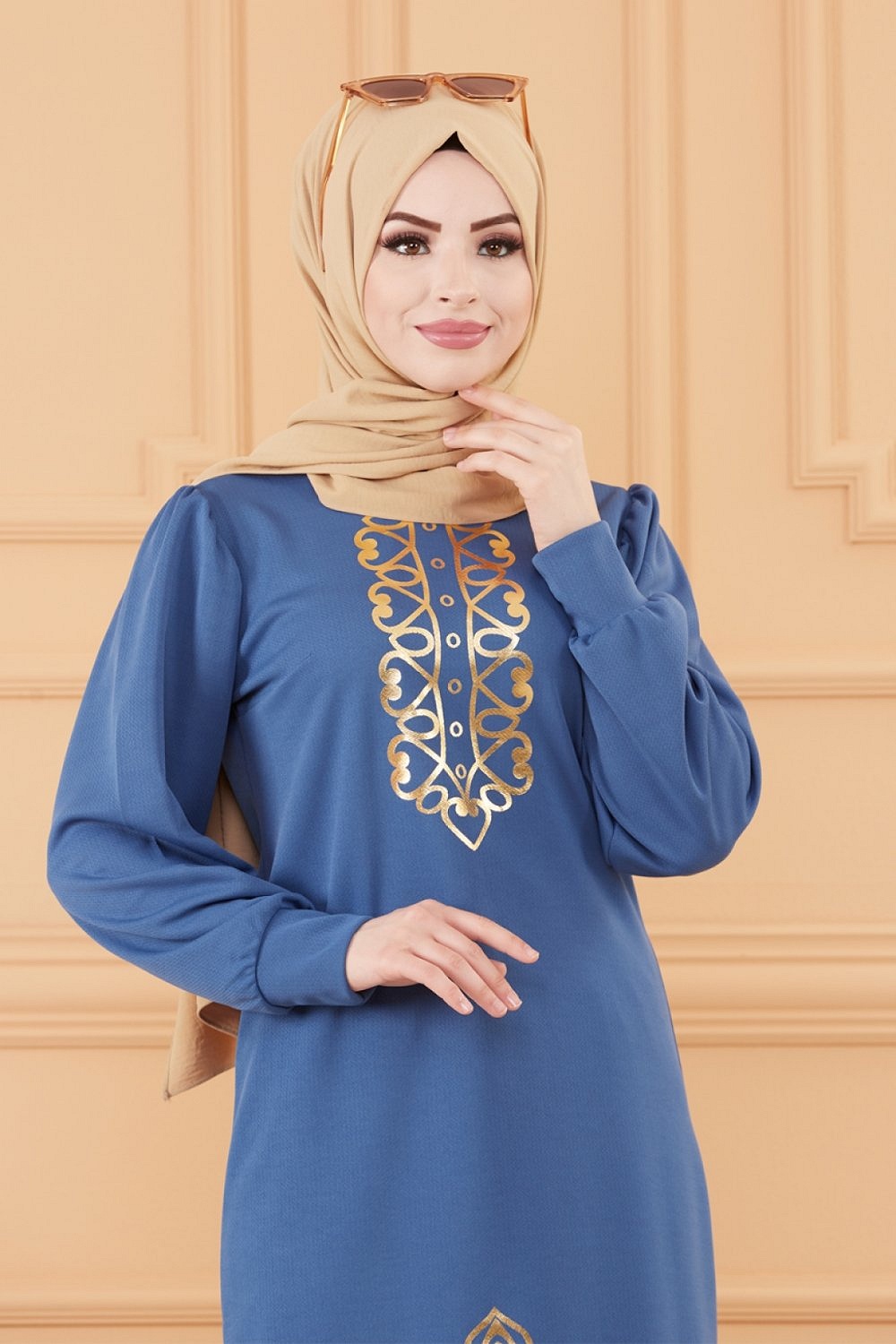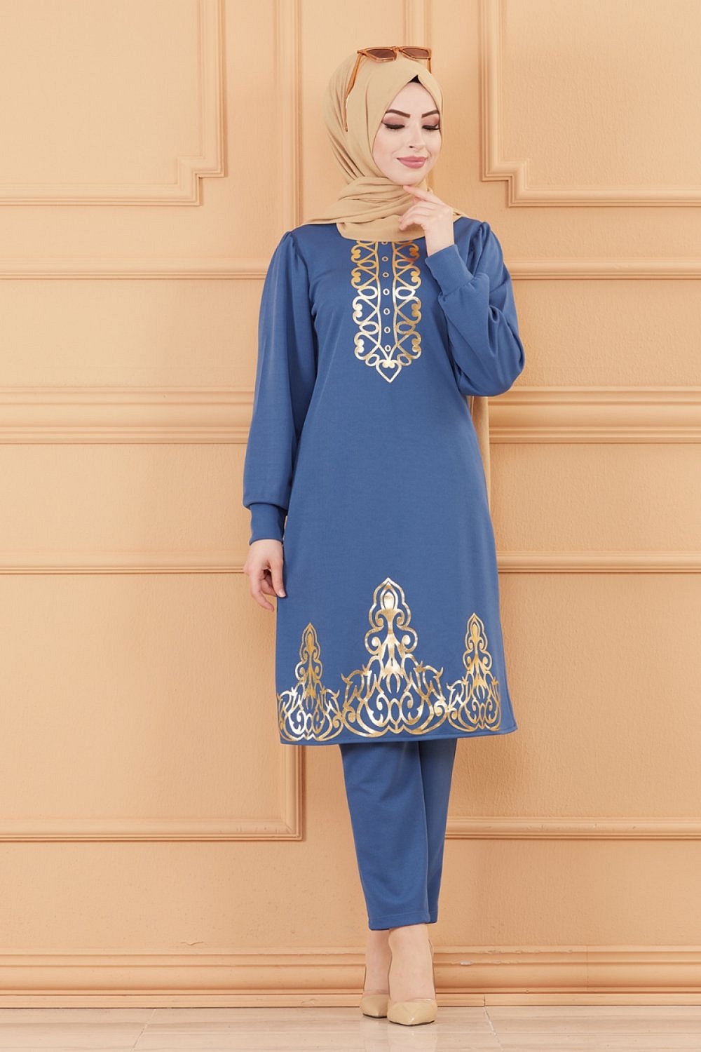 Ensemble tunique motif doré et pantalon (Tenue orientale pour femme voilée) - Couleur bleu indigo Vetement & Accessoire