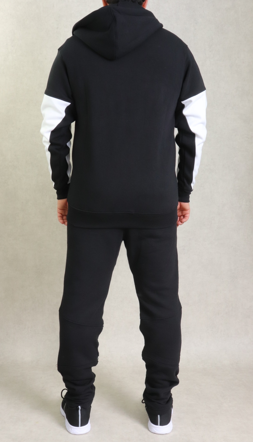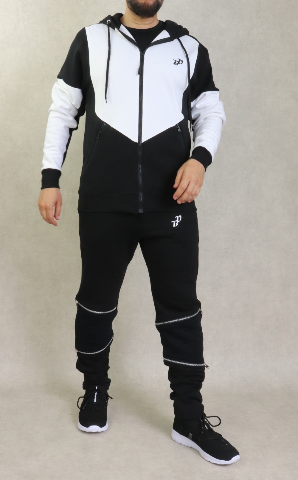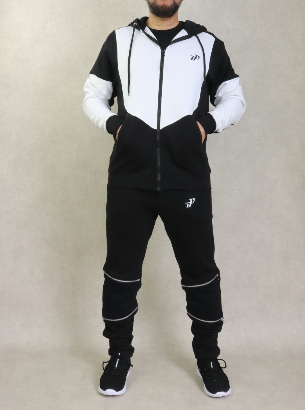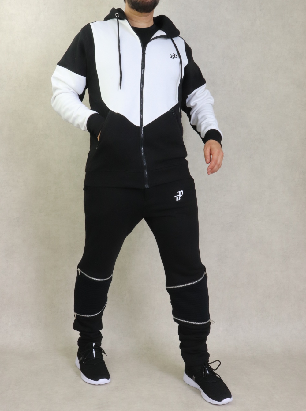 Ensemble constitué d'une veste bi-colore, plus longue à l'arrière qu'à l'avant. Tissu léger coton de qualité. Deux poches zippées sur les côtés. Capuche doublée avec cordons, et pantalon zippé assorti