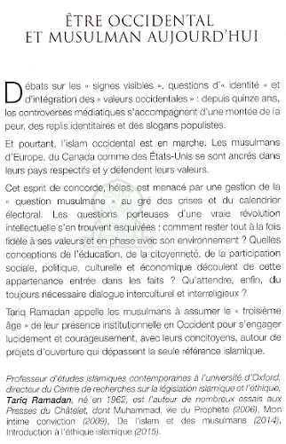 Les musulmans d’Occident, d’Europe comme des États-Unis, se sont définitivement inscrits dans leurs pays respectifs. Après des années d’une présence pensée de façon temporaire, le temps est venu pour les nouvelles générations d’élaborer une réflexion sur les sources scripturaires, les fondements religieux et éthiques et leur enracinement dans les sociétés sécularisées. Les musulmans en Occident doivent-ils se considérer sur un sol étranger, gouvernés par la contrainte, avec le seul devoir de se protéger d’un environnement « hostile » ? Ou doivent-ils se sentir « chez eux » et agir en tant que véritables citoyens ? En nommant les pays occidentaux dar ash-shahada (espace du témoignage), les musulmans dépassent ainsi l’ancienne vision bipolaire mettant face à face Dar al-harb (la demeure de la guerre) et Dar al-islam (la demeure de l’islam). Se considérant pleinement témoins devant l’humanité – selon la formule coranique –, ils portent dès lors témoignage de ce qu’ils sont et de leurs valeurs, dans une authentique contribution. Il s’agit pour les musulmans de rester tout à la fois fidèles à leurs valeurs et en phase avec leur environnement. Autrement dit : il n’est pas question d’être moins musulman pour être plus occidental ou européen. Il est possible, affirme Tariq Ramadan, d’être des musulmans convaincus, sincères et pratiquants et d’authentiques citoyens européens.
