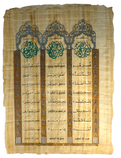 Papyrus fait main par un calligraphe montrant Sourate al-Ikhlâs, Sourate al-Falaq et Sourate an-Nas (ces trois sourates commencent toutes par "Qul قُل").