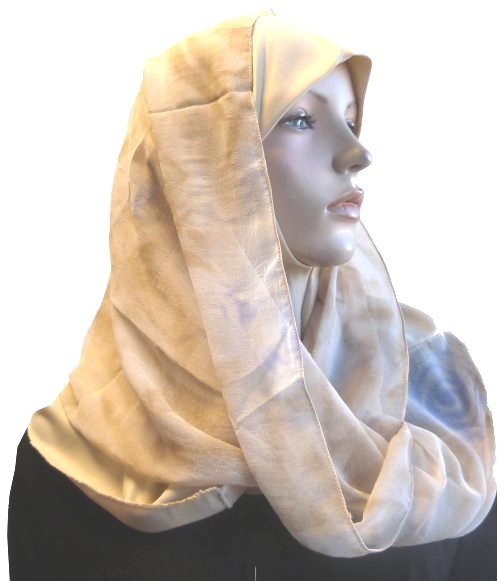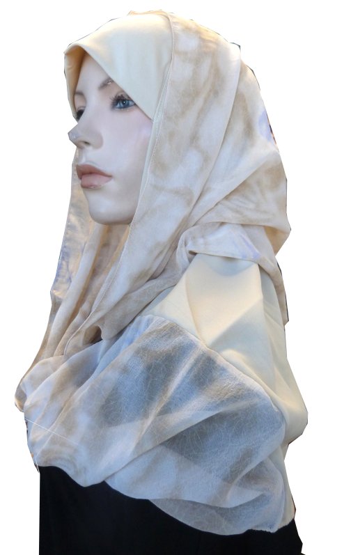 Foulard hijab 1 pièce une partie matière élastique de couleur beige et une partie légère à positionner par dessus en crêpe à motifs fleurs marron clair et bleu ciel.