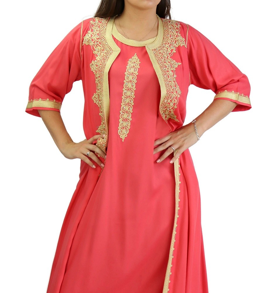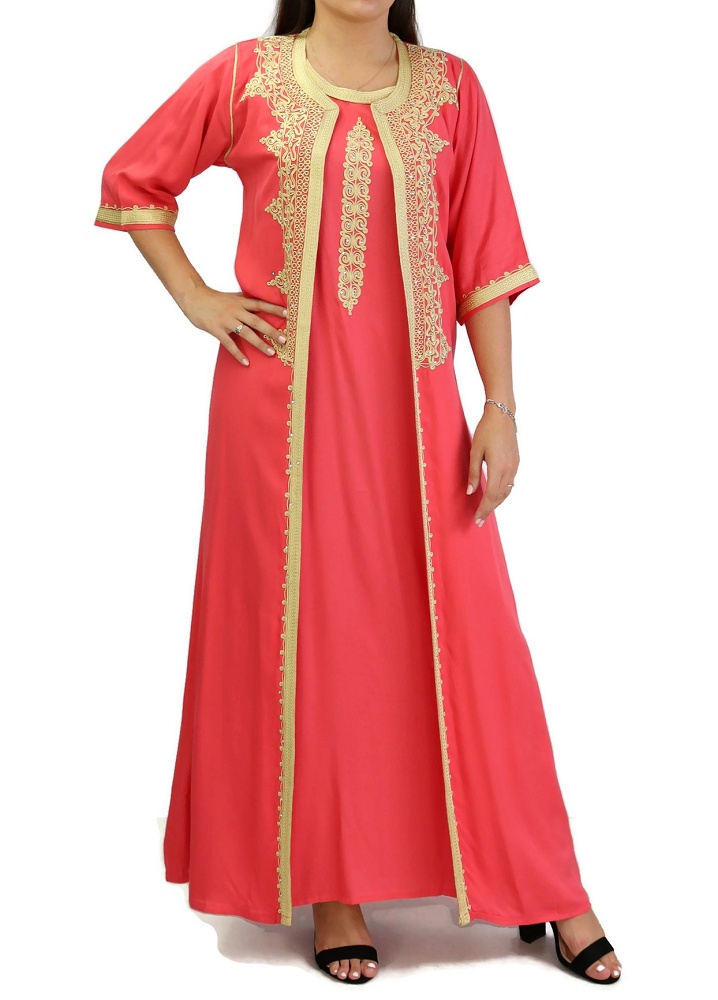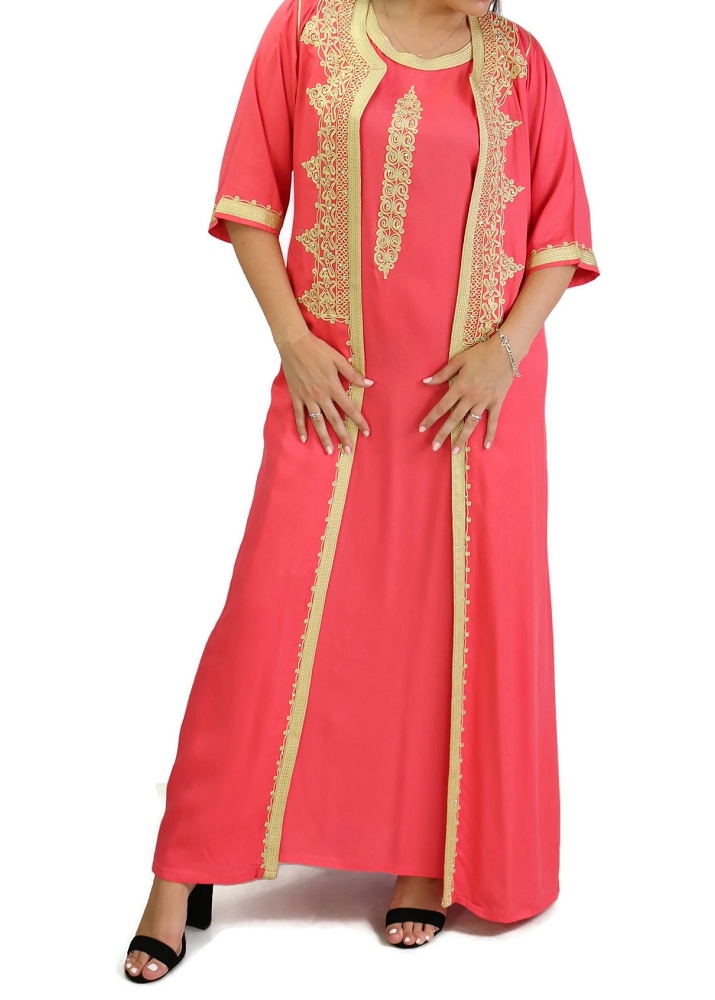 Gandoura marocaine (ensemble deux pièces robe et kimono) avec broderies dorées - Couleur rose saumoné Vetement & Accessoire