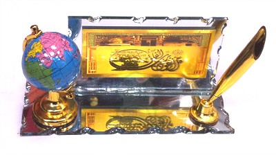 Garniture de bureau avec un verset calligraphie sur un miroir, un globe et un porte stylo