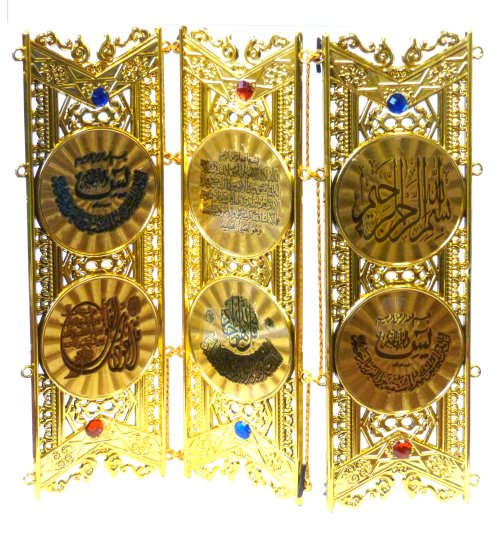 Pendentif islamique décoratif doré avec le début de Sourate Yassine et le nom du prophète Muhammad et l'attestation de foi (chahada) - REF. 23980 (4.50 €)