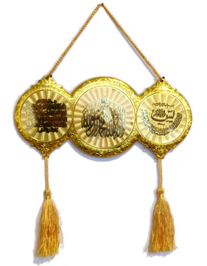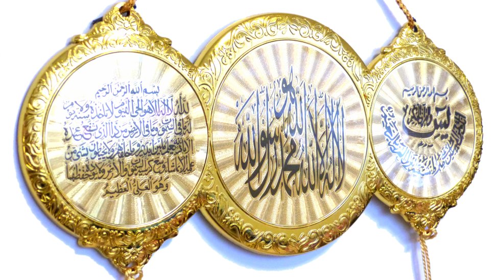 Garniture dorée avec trois parties rondes contenant Verset De Sourate Yassin, Verset du Trône (Ayatoul Koursî).