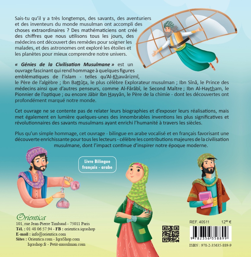« Génies de la Civilisation Musulmane » est un ouvrage fascinant qui rend hommage à quelques figures emblématiques de l’islam - telles qu’Al-Khawârizmî, le Père de l’algèbre ; Ibn Battûta, le plus célèbre Explorateur musulman ; Ibn Sînâ, le Prince des médecins ainsi que d’autres penseurs, comme Al-Fârâbî, le Second Maître ; Ibn Al-Haytham, le Pionnier de l’optique ; ou encore Jâbir Ibn Hayyân, le Père de la chimie - dont les découvertes ont profondément marqué notre monde.
