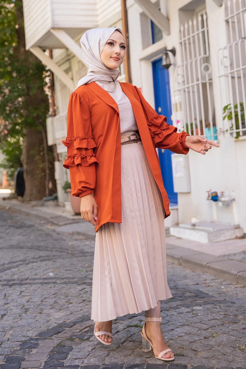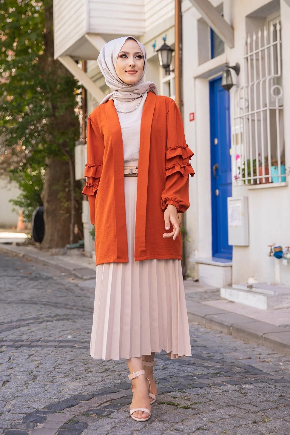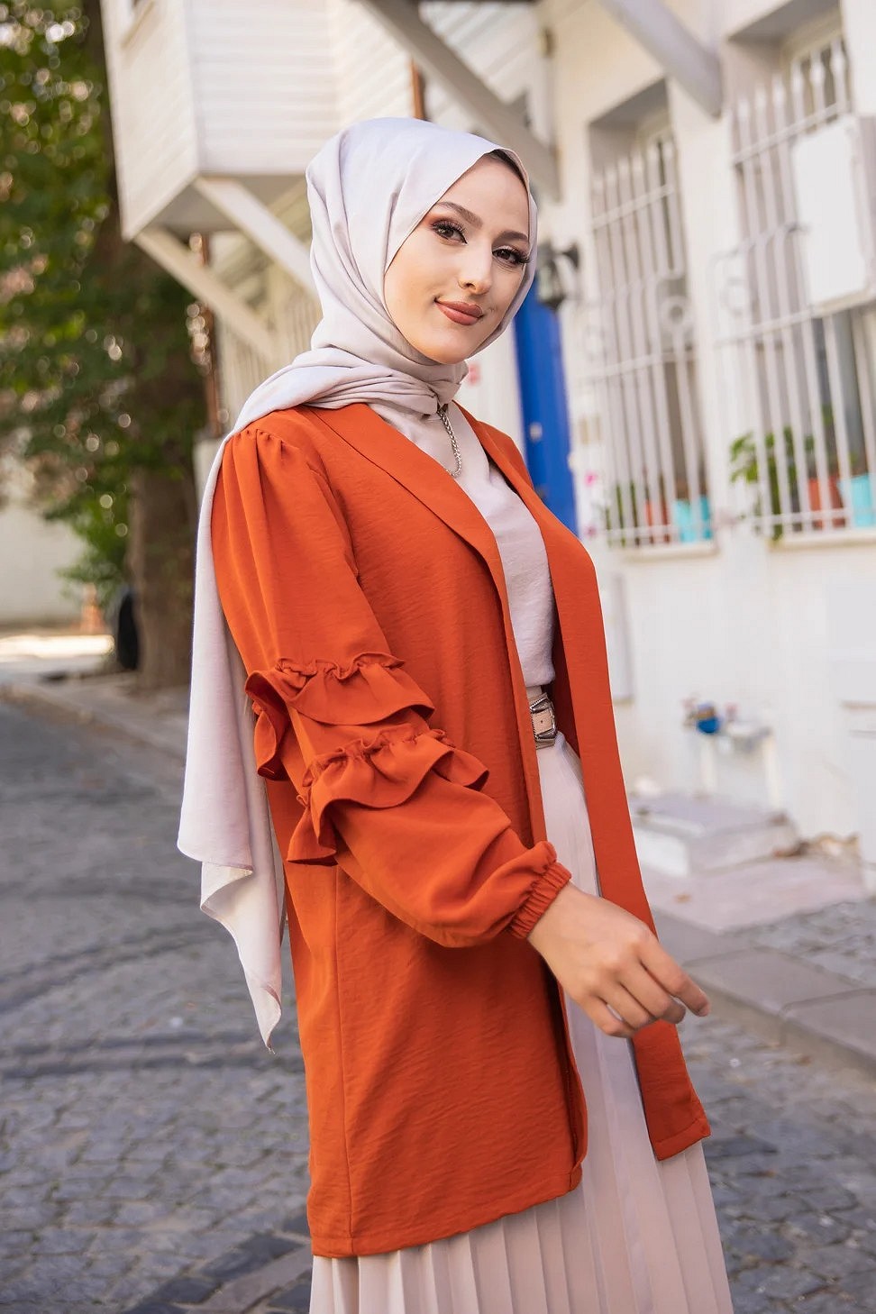 Gilet Veste long manches à froufrou (Boutique Vêtements femmes voilées) - Couleur Rouille Vetement & Accessoire