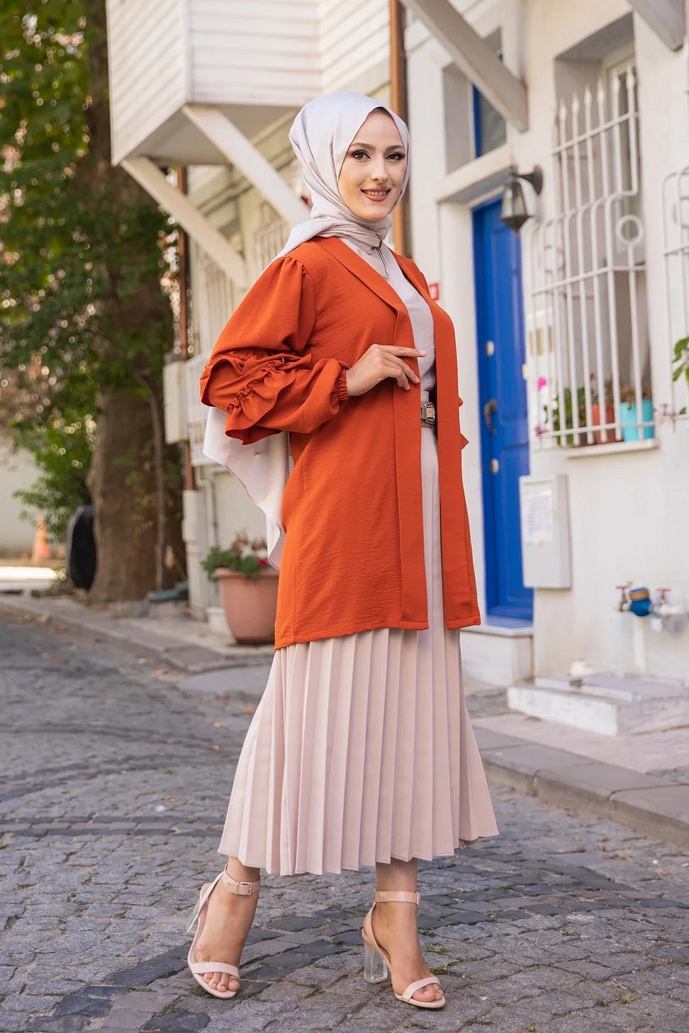Gilet Veste long manches a froufrou (Boutique Vetements femmes voilees) - Couleur Rouille