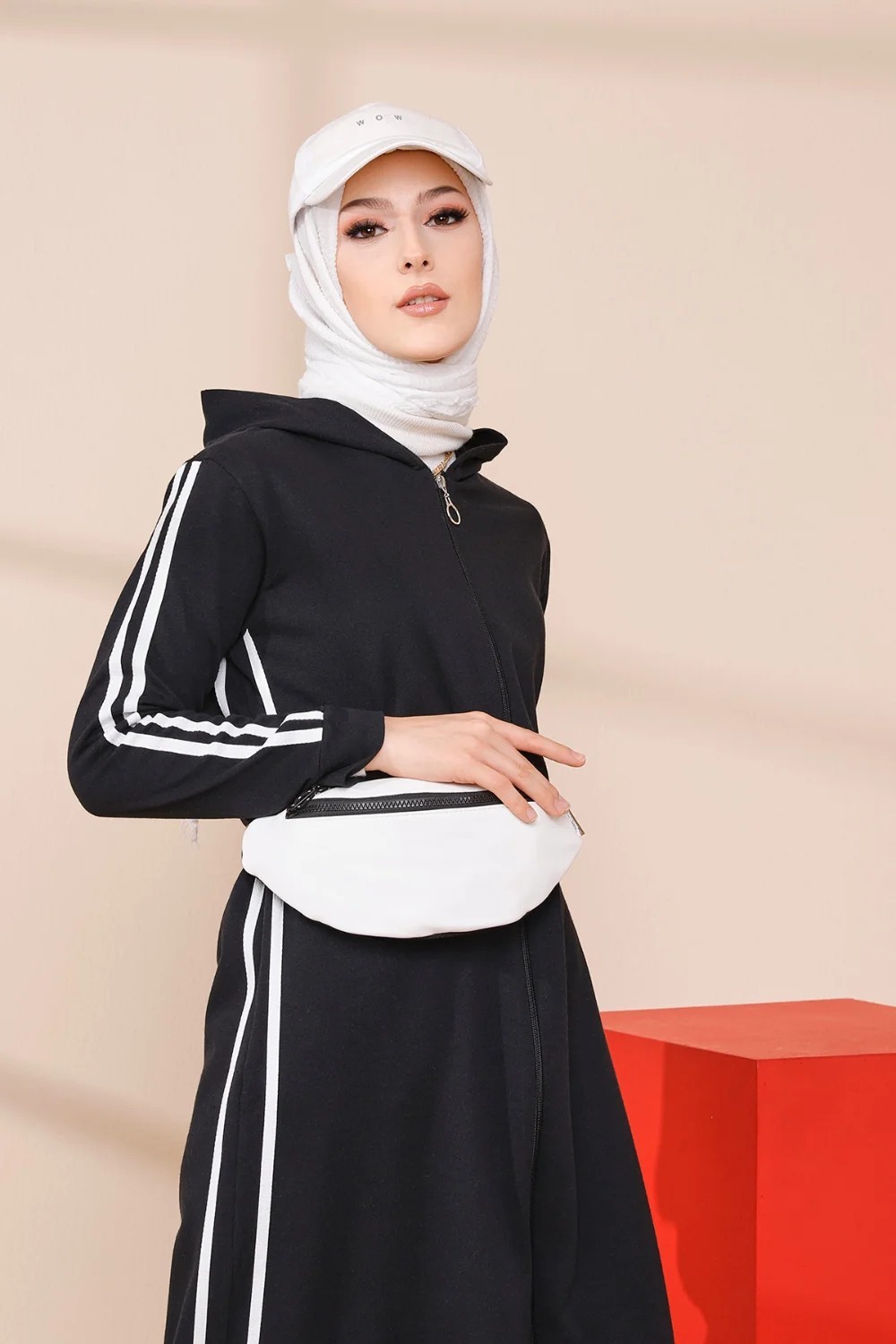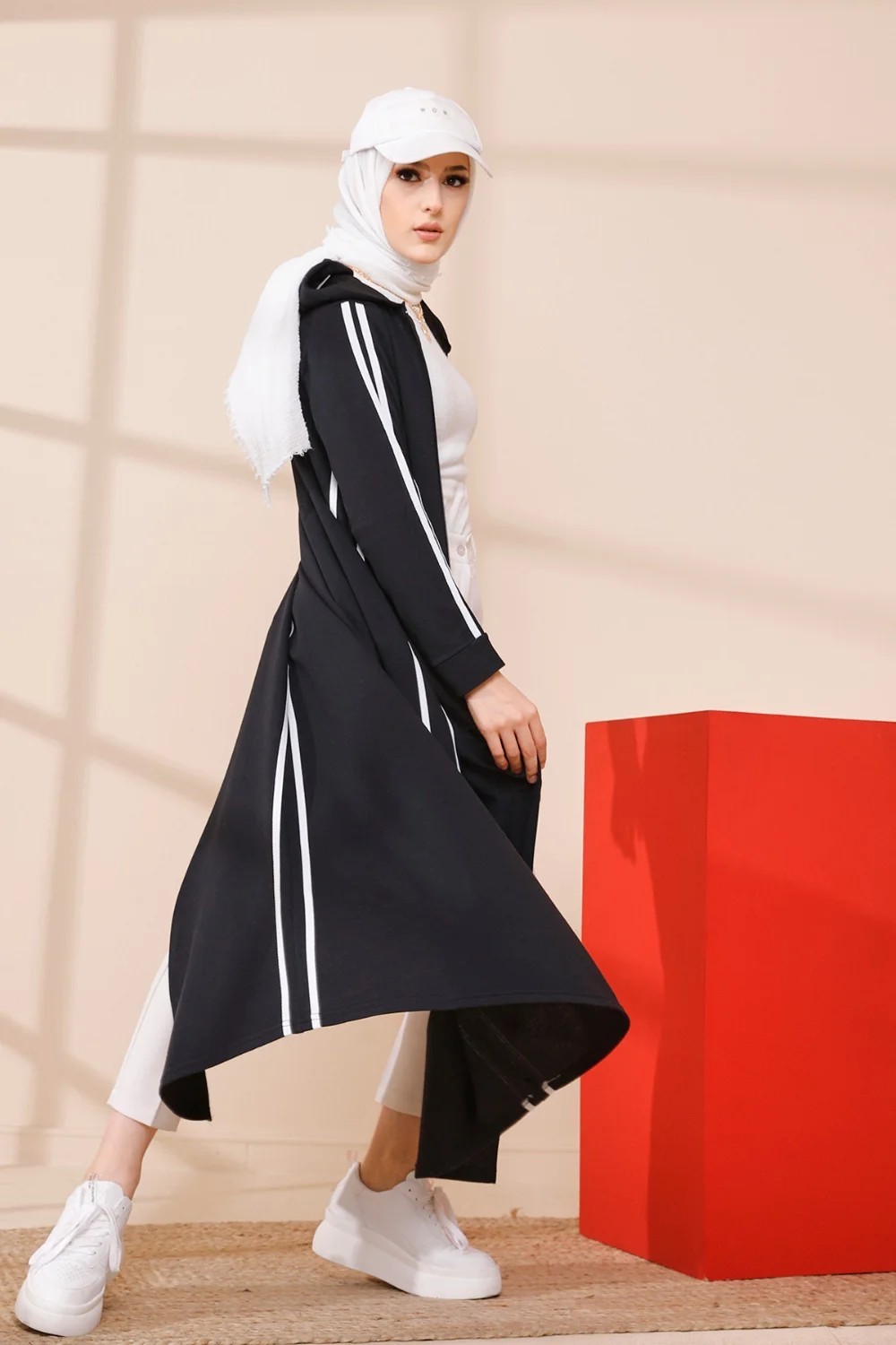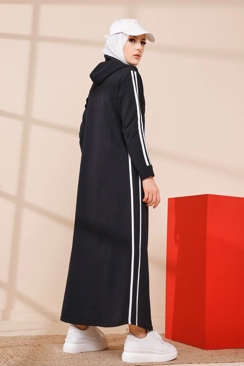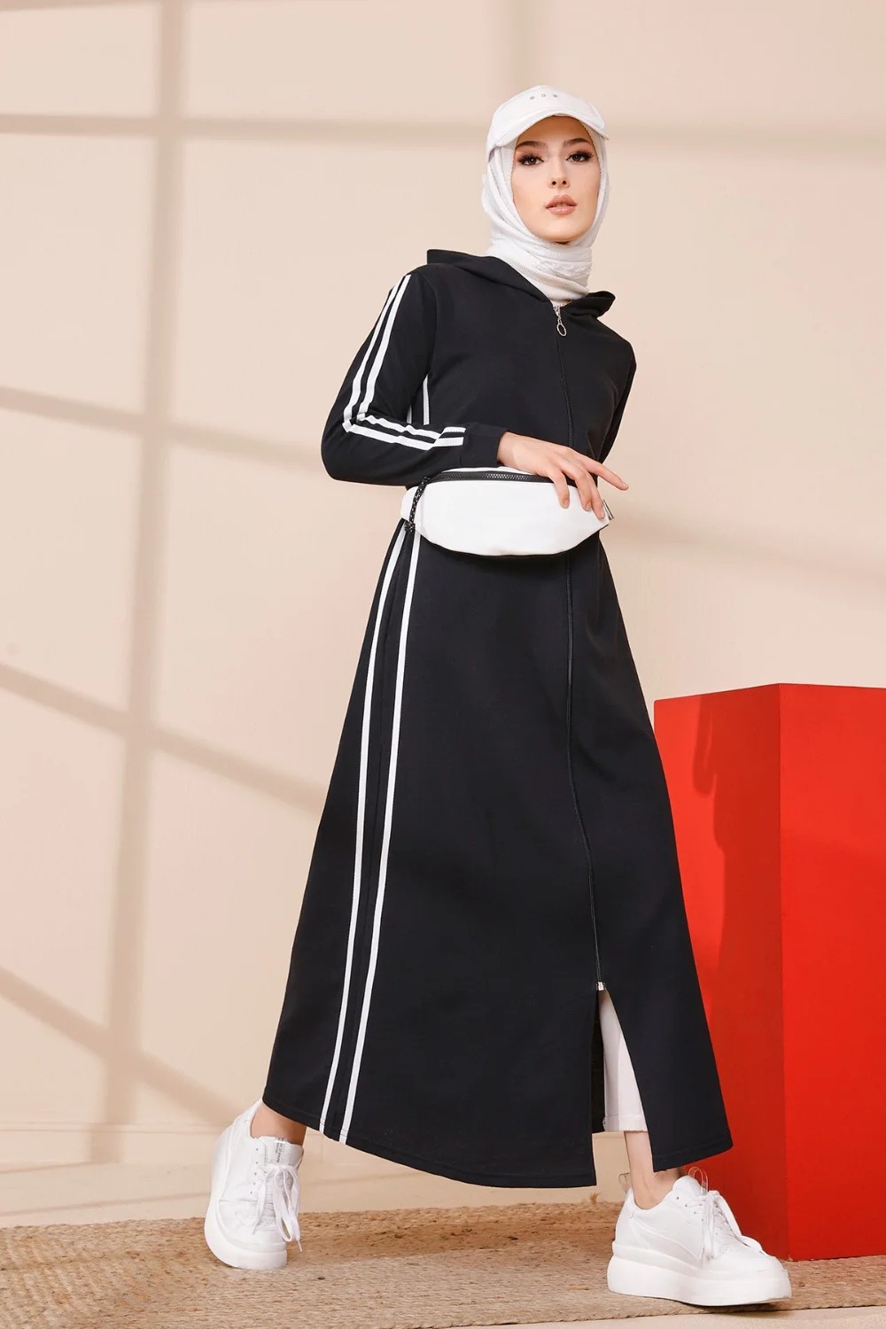 Tunique à capuche et bandes noires pour femme (Mode musulmane) - Couleur noir - REF. 35854 (19.00 €) - En Promotion à 15.90 €