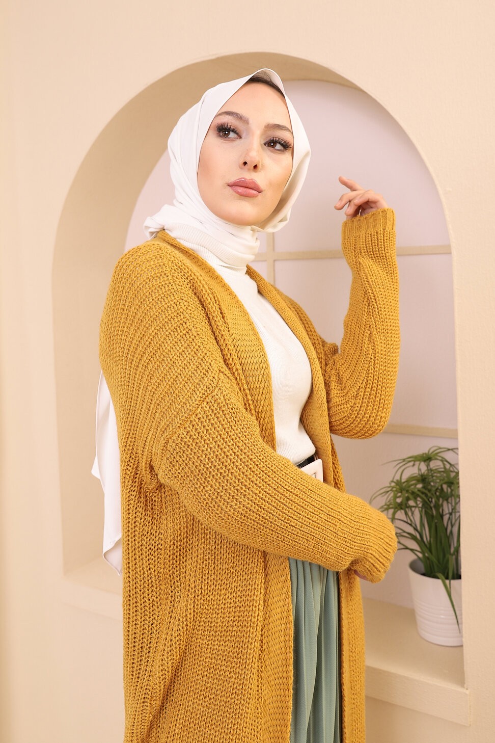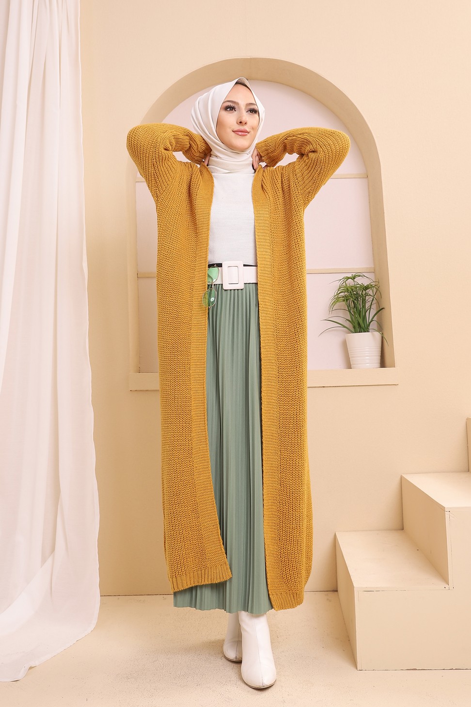Gilet long en maille - Cardigan femme - Couleur moutarde Vetement & Accessoire