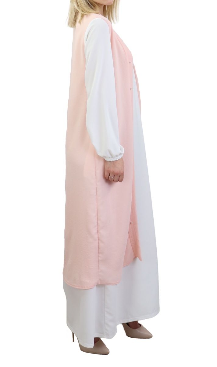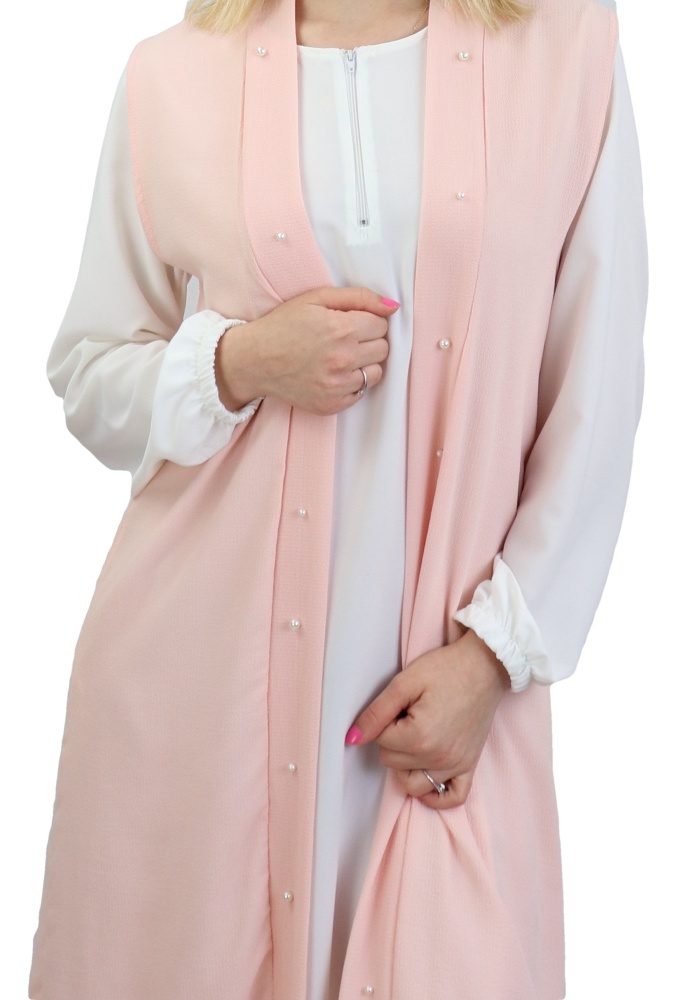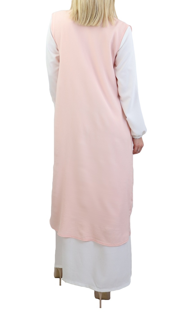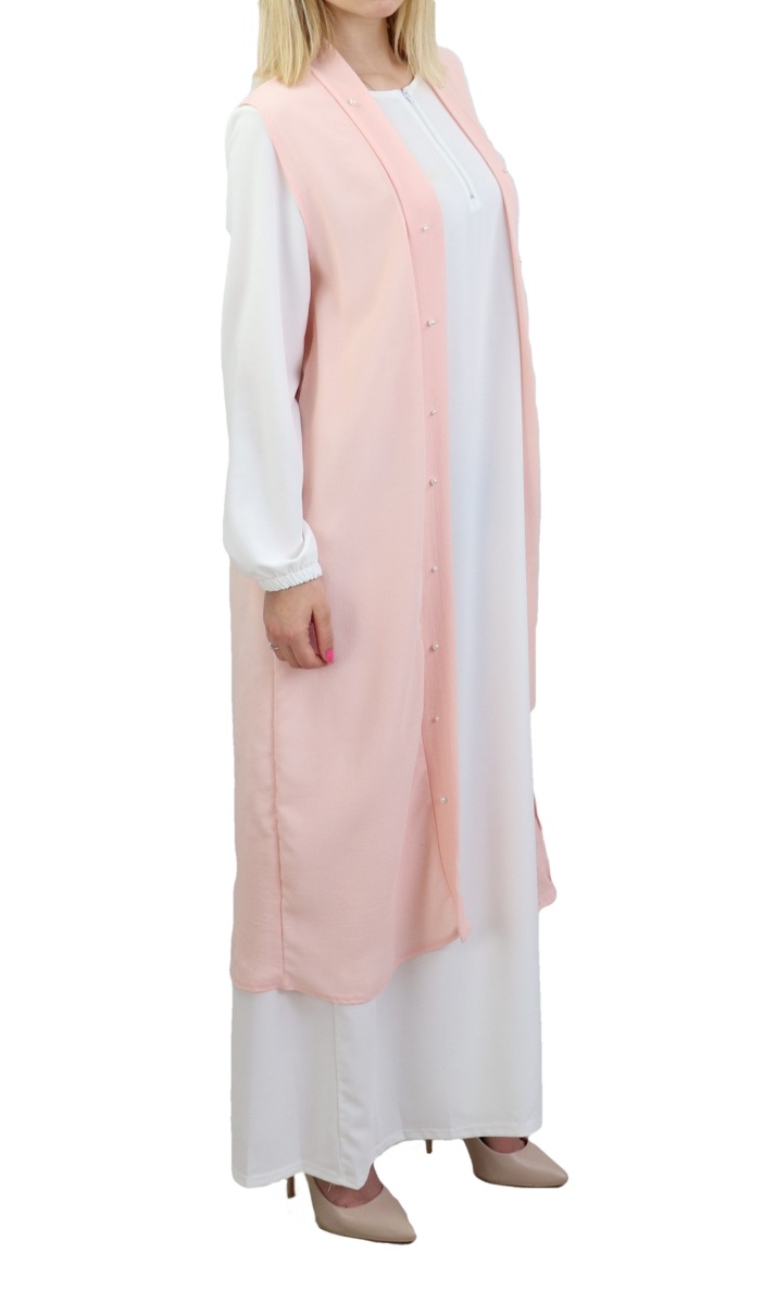 Gilet long, sans manche, décoration perlée, tissu fluide, effet crêpe.