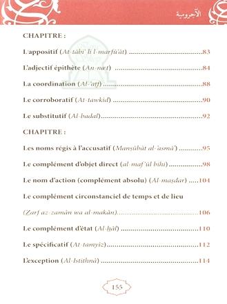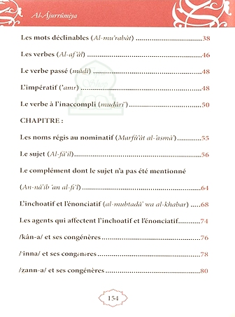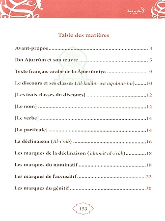 La Ajurrûmiya est un livre de grammaire arabe qui traite essentiellement de la syntaxe, autrement dit, des rapports qui existent entre les différentes fonctions syntaxiques. Bien que cet opuscule soit destiné aux élèves de cours élémentaires, il nécessite néanmoins quelques explications. C'est pourquoi, après l'avoir traduit vers le français, nous l'avons enrichi de notes explicatives et d'exemples d'illustration afin d'en rendre l'approche plus aisée.