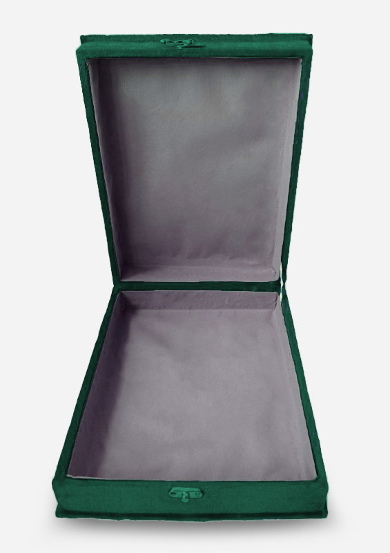 Grande boite en bois recouverte de velours de 7 cm d’épaisseur, vous pouvez y mettre même un Coran bilingue (français/arabe) épais ou plusieurs livres et des objets. Vous pouvez utiliser ce coffret également pour ranger vos bijoux ou autres effets personnels...