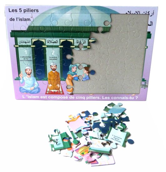 Puzzle bilingue (français / arabe) avec illustration des cinq piliers de l'islam.