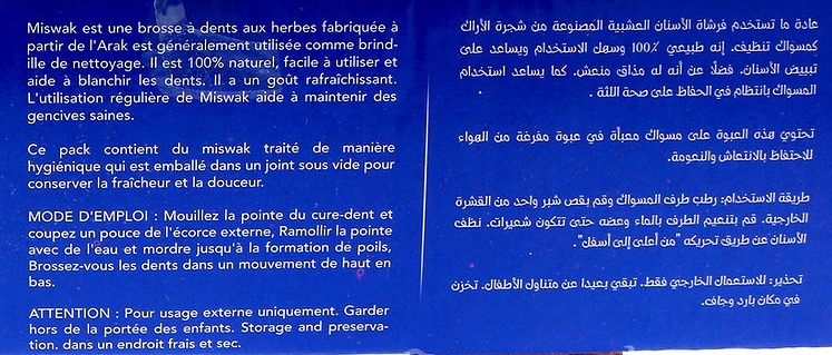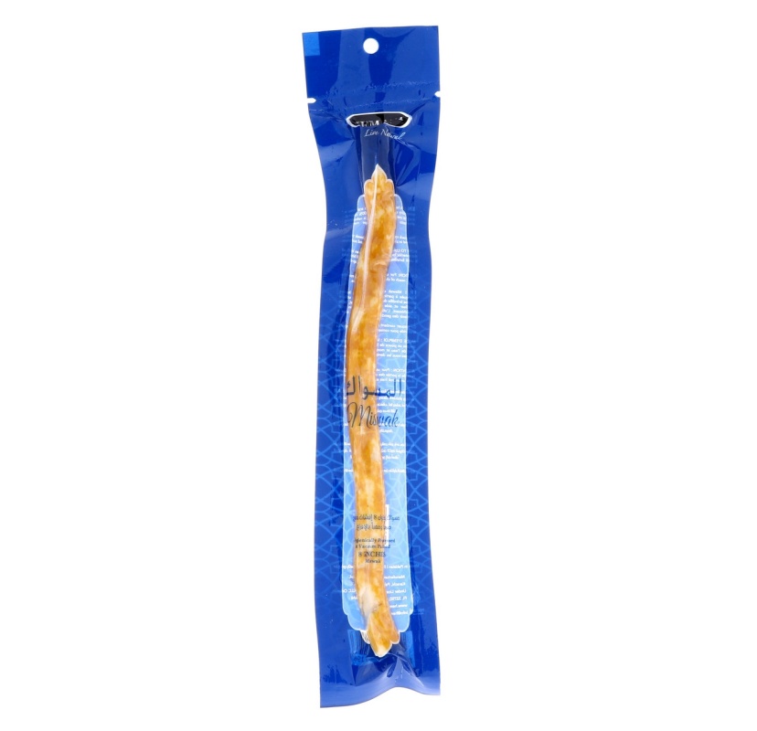 Emballé sous vide pour conserver fraîcheur et douceur. L'écorce à la pointe s'enlève facilement même sans l'utilisation d'un couteau. Mâchez les poils pour séparer les fibres naturelles et former des poils de brosse à dents. Pour nettoyer les dents, brossez avec Miswak du bord des gencives dans un mouvement de haut en bas jusqu'au bord tranchant des dents.