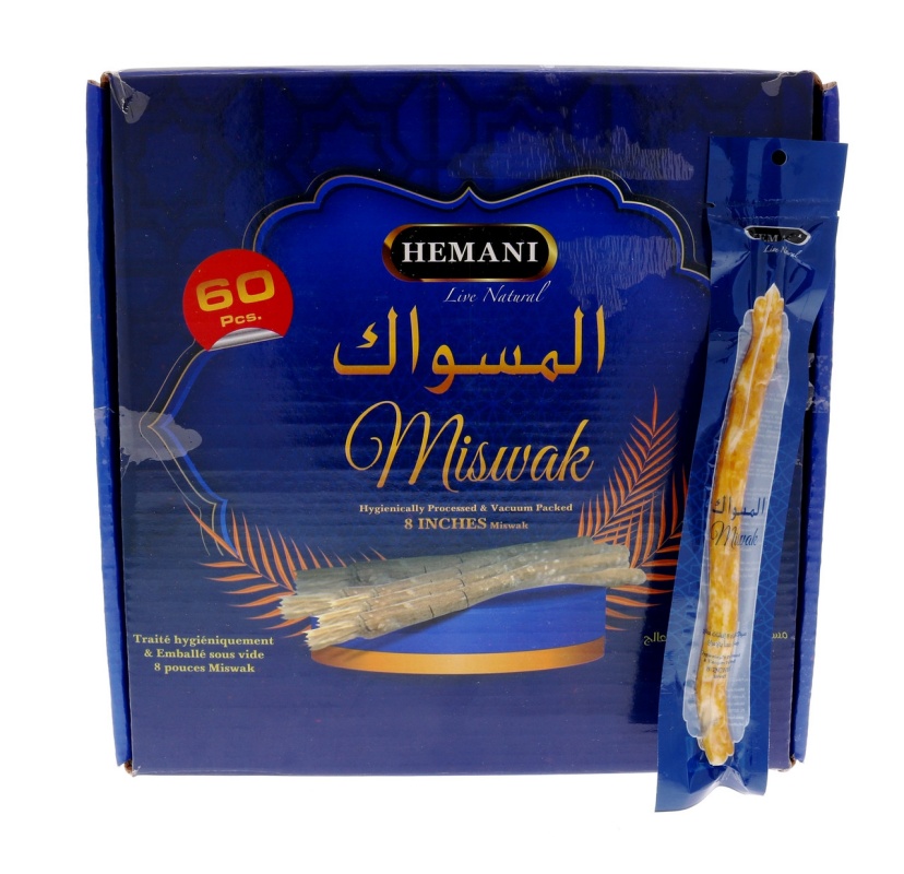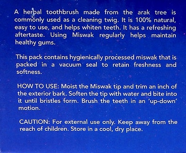 Le miswak ou siwak est un outil naturel pour se brosser les dents. Il est tiré des racines de l'arbre Arak, en particulier dans la péninsule arabique et dans certaines parties de l'Asie, l'arbre est connu sous le nom de Peelu. Miswak est un stick naturel multi-usages qui nettoie et blanchit les dents et rafraîchit l'haleine, et est largement utilisé dans le monde islamique. L'utilisation du sewak est recommandée par le Prophète Muhammad (paix et salut sur lui).