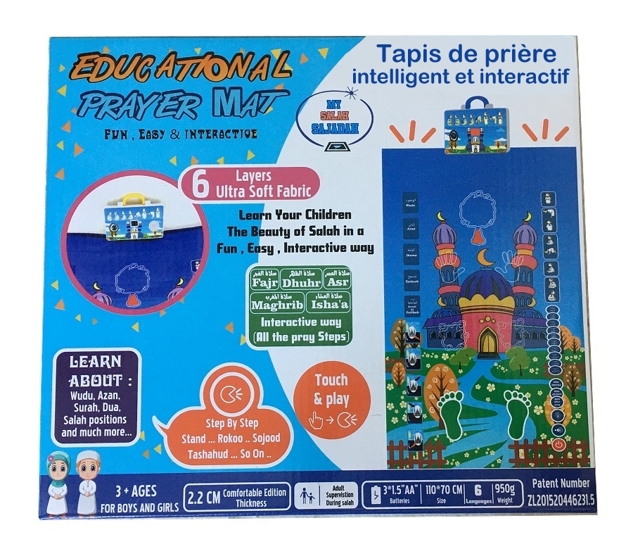 Ce tapis interactif est un outil pédagogique pour l'apprentissage précis de la prière tant au niveau des gestes que des paroles. Ce tapis interactif et pédagogique permet aux enfants comme aux adultes qui débutent la pratique de la prière, d’en faciliter l'apprentissage de façon autonome.