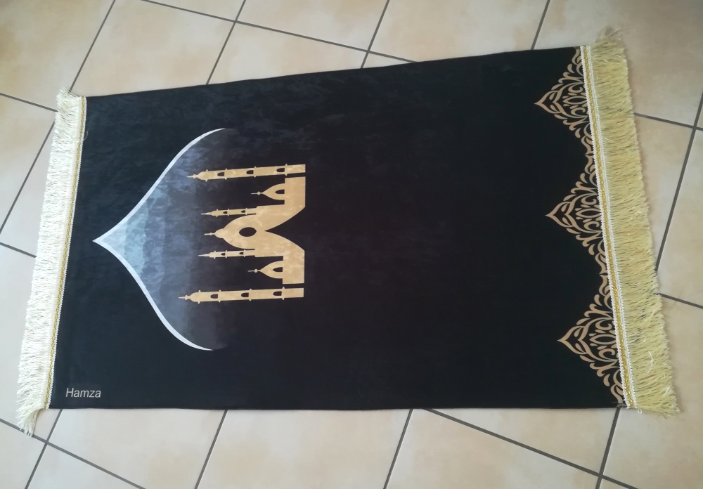 Grand Tapis de priere adulte couleur noir dore en velours brillant personnalise avec le prenom de votre choix