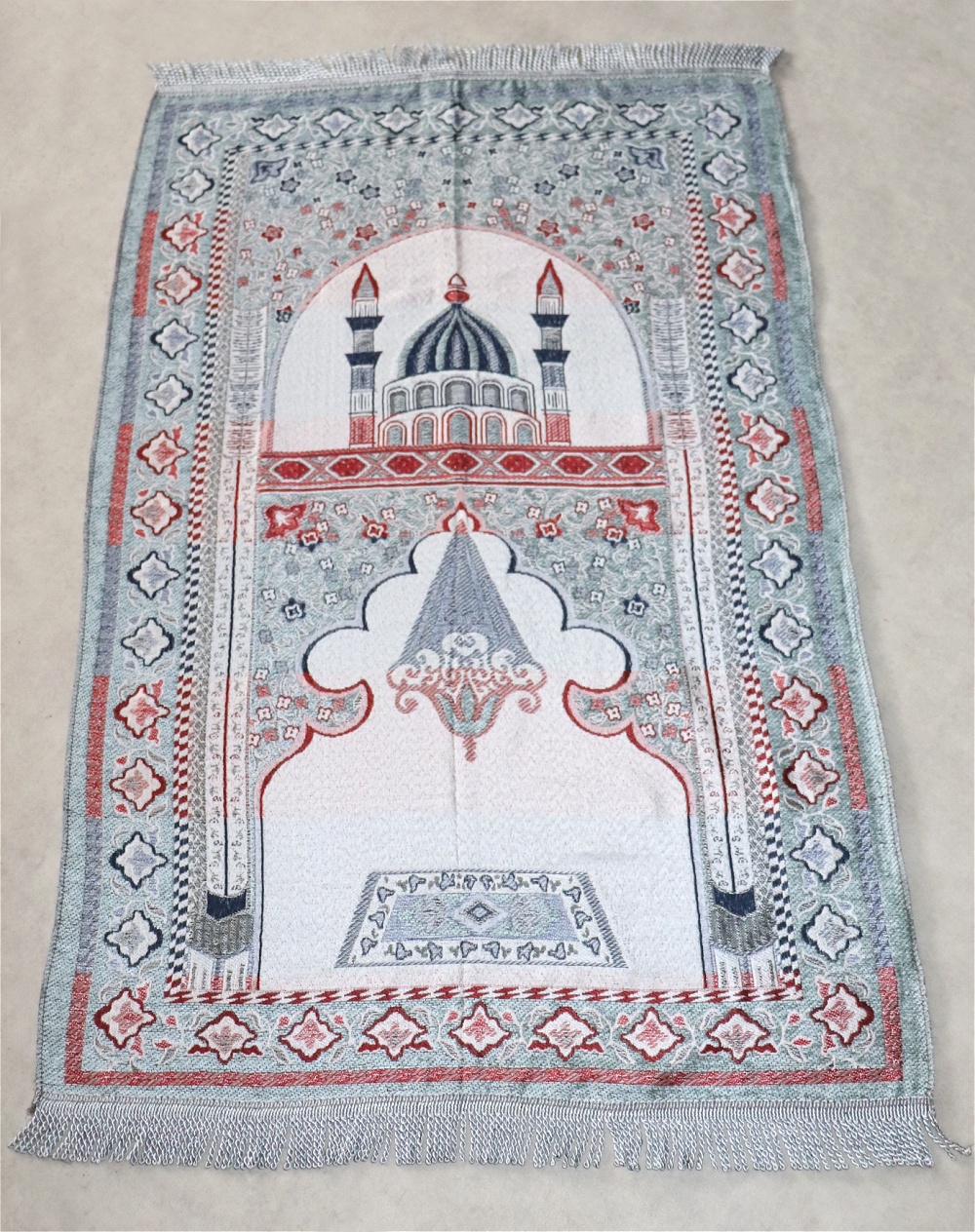 Grand Tapis de priere avec decorations islamique tisse en chenille (sajjada) - Couleur vert clair et Gris