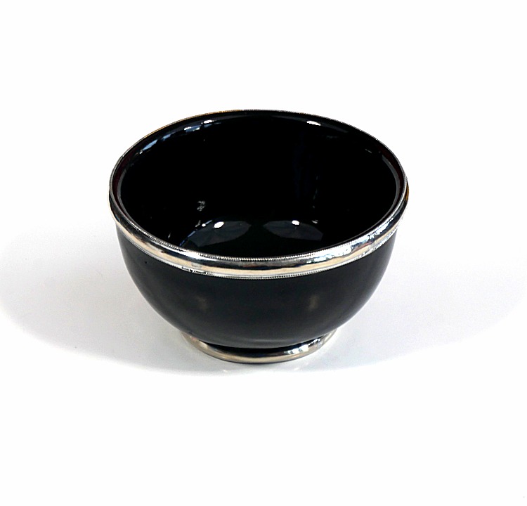 Grand bol en poterie marocain de couleur noir emaille et cercle de metal argente