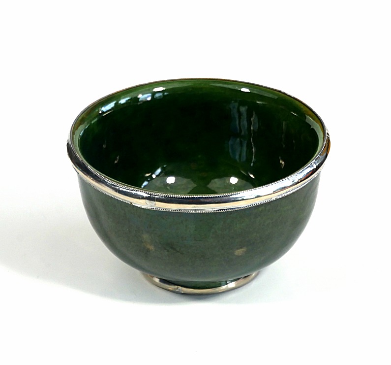 Bol moyen en poterie marocain de couleur vert foncé émaillé et cerclé de métal argenté