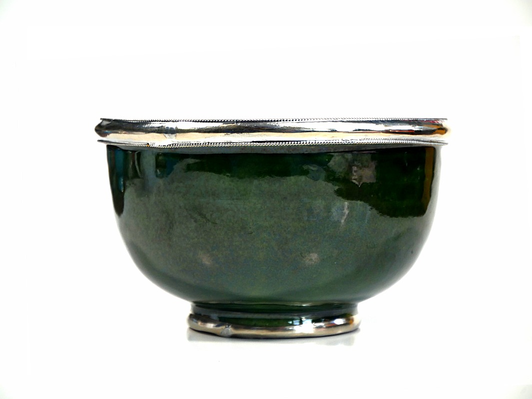 Grand bol en poterie marocain de couleur vert fonce emaille et cercle de metal argente