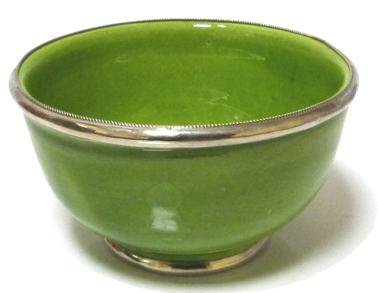 Bol moyen en poterie marocain de couleur verte émaillé et cerclé de métal argenté