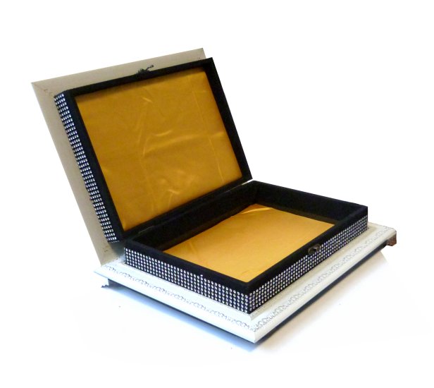Grand coffret en bois argenté et décoré de strass sur velours. Idéal pour y ranger un Coran ou y mettre d'autres objets précieux.