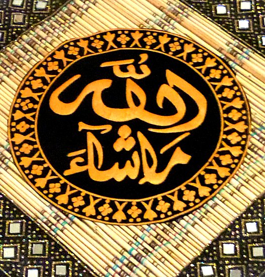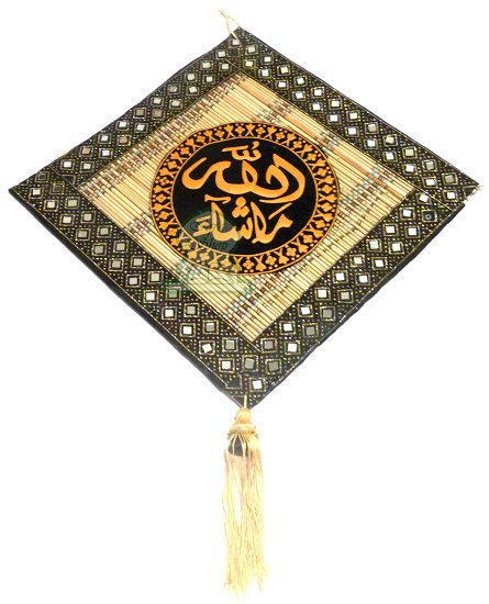 Sous forme de losange à accrocher au mur. Avec de jolies motifs brillants, se termine par un pompon. Une traduction de cette expression est : C'est ce qu'Allah a voulu.