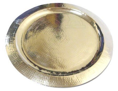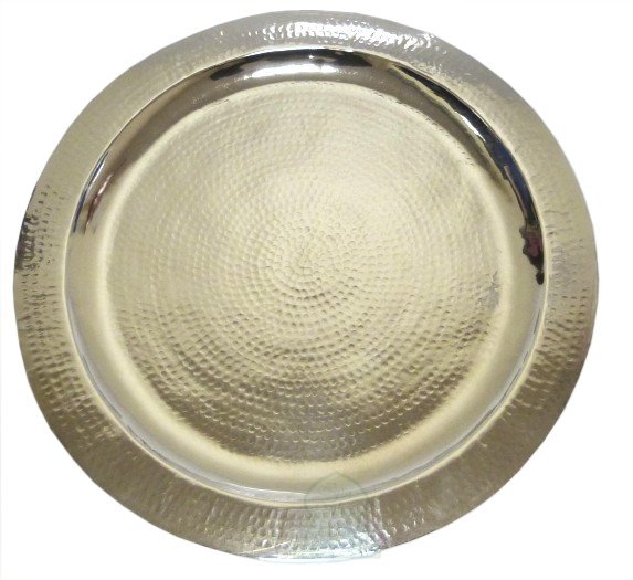 Grand plateau marocain rond de fabrication artisanale en metal argente cercle et finement martele - diametre 40 cm
