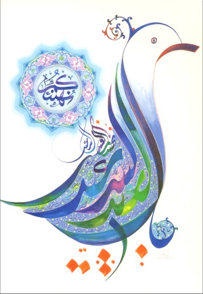 Grande Carte de voeux double : Calligraphie arabe "Nous vous souhaitons une joyeuse fete" (sous forme d'oiseau)