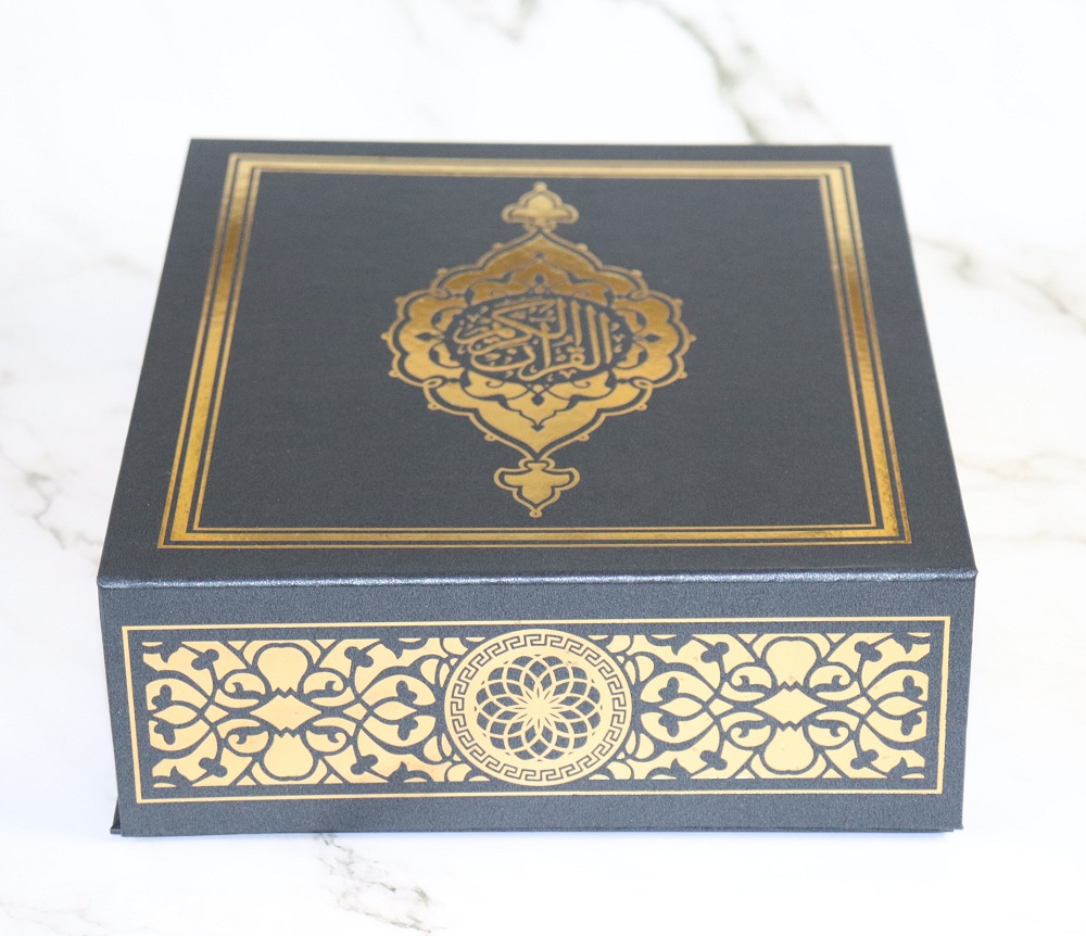 Boite coffret en carton rigide avec 2 pastilles aimantées pour le rabat de fermeture du couvercle. Inscription calligraphique en arabe al-Qurân Al-Karîm القرآن الكريم et décorations arabesques dorées.