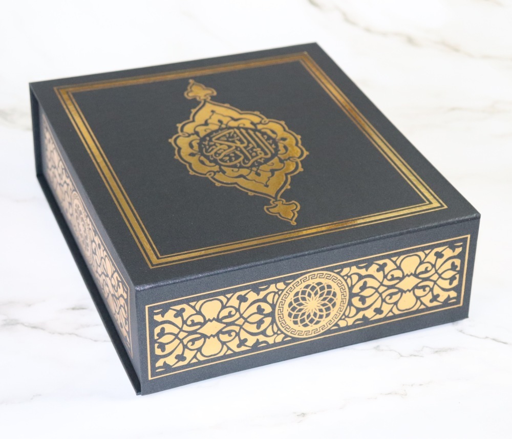Grande boite cadeau rigide (cartonnée) avec fermeture magnétique et inscription "Le Saint Coran" en arabe calligraphique (القرآن الكريم) - Couleur noir doré.