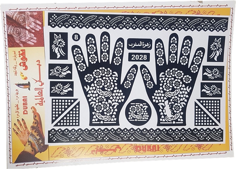 Grande plaque de motifs de tatouages au henné, idéal pour vos parfaire vos tatouages au henné pour vos mariages et fêtes. Photo non contractuelle