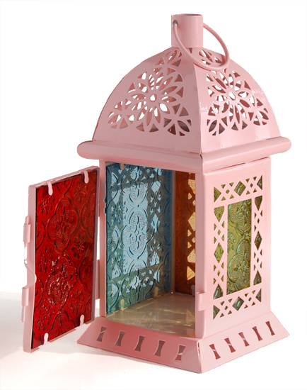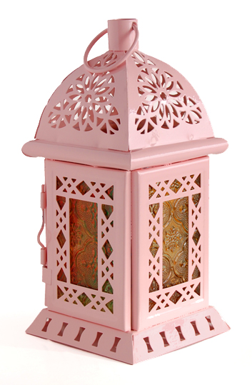 Lanterne décorative métallique de couleur rose, avec anneau de suspension. Les vitres sont en verre coloré avec des motifs géométriques en relief. Une porte s'ouvre pour donner accès à l’intérieur de la lanterne. Cette lanterne décorative est magnifiquement ciselée de formes géométriques.