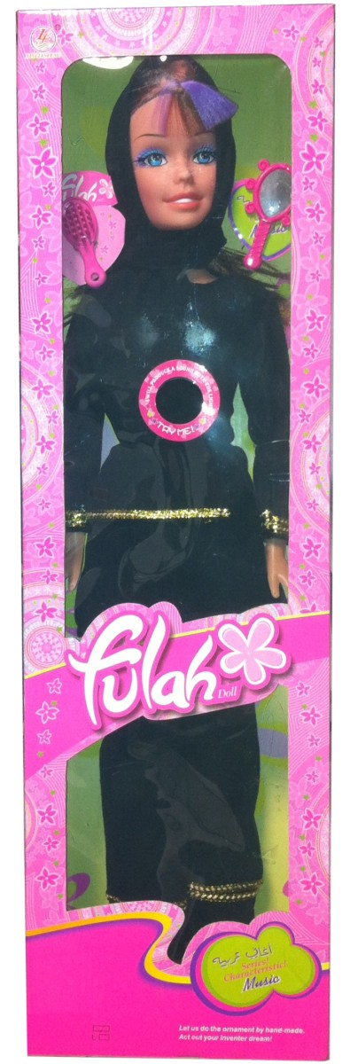 Grande poupée Fulah (60 cm de haut) avec hijab et accessoires. Quand on presse le bouton situé au niveau du ventre on entend un chant islamique "Ya Tayba".