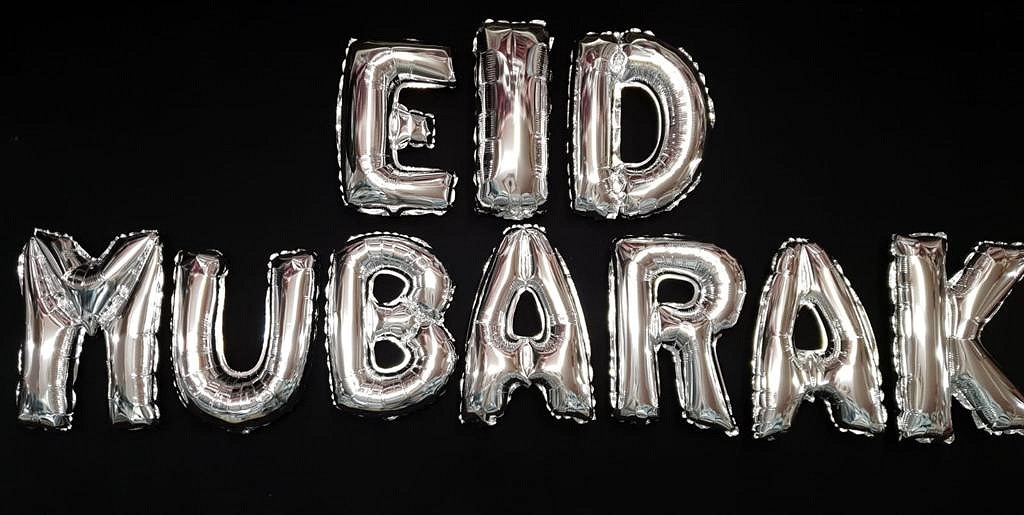 Ensemble de 10 grands Ballons en aluminium en lettres dorées formant l'écriture Eid Mubarak. Ensemble avec 4 mètres de fil et une paille pour gonfler les ballons.