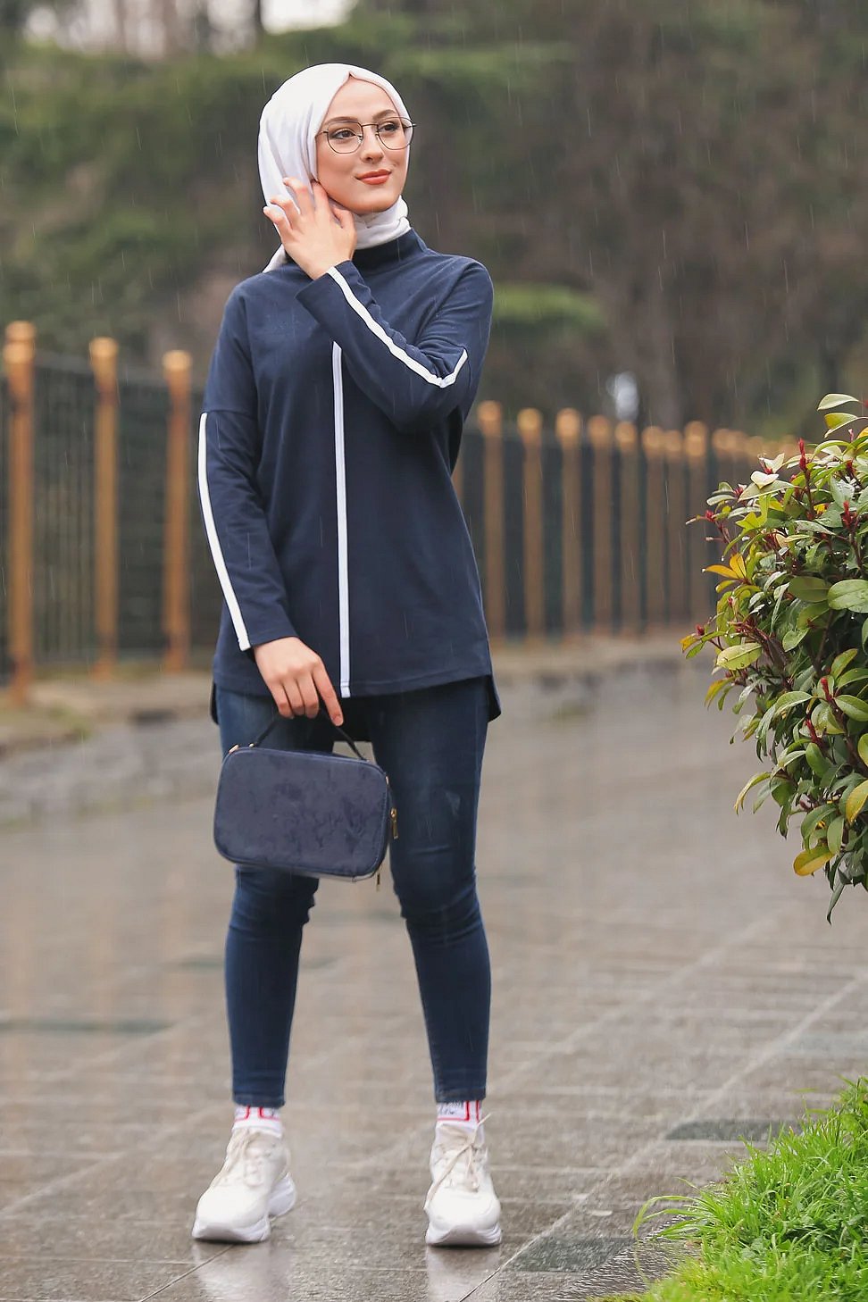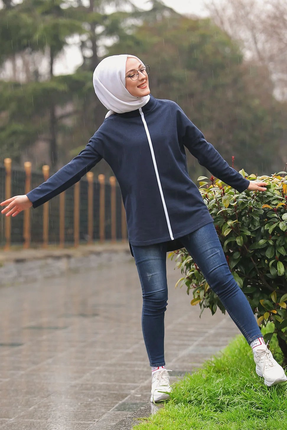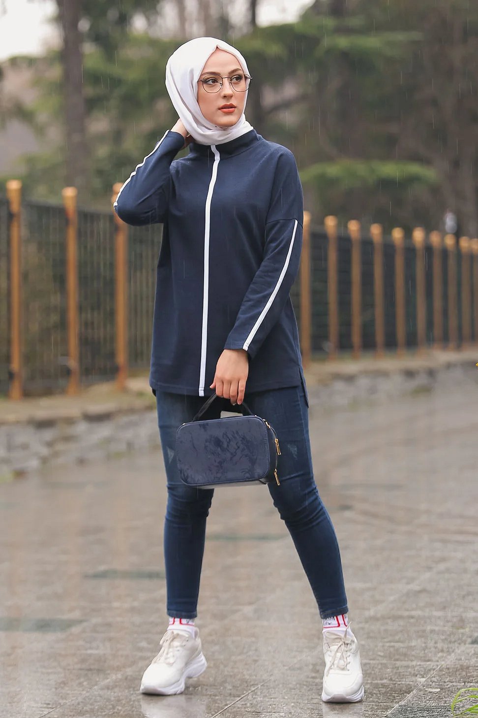 Survêtement deux pièces : Veste et Pantalon à bande blanche (Ensemble Sport Hijab pour femme) - Couleur bleu nuit - REF. 35171 (28.00 €)