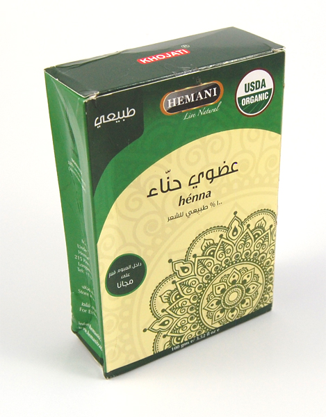 Henné Bio de marque Hemani-Khojati pour coloration naturelle à bases de plusieurs plantes naturelles utilisées pour leur teinte. 100% naturelle Bio Eco-cert. Fournie avec une paire de gants.